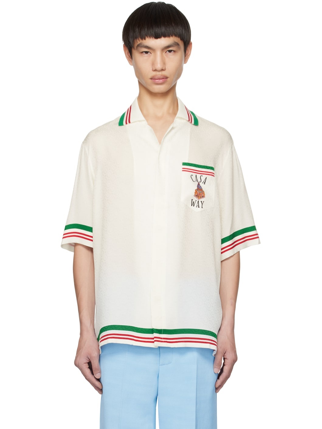 Plain-woven silk shirt. Jacquard logo pattern and stripes printed throughout. · Knit spread collar · Concealed button closure · Logo graphic printed at patch pocket and back Supplier color: Casa way