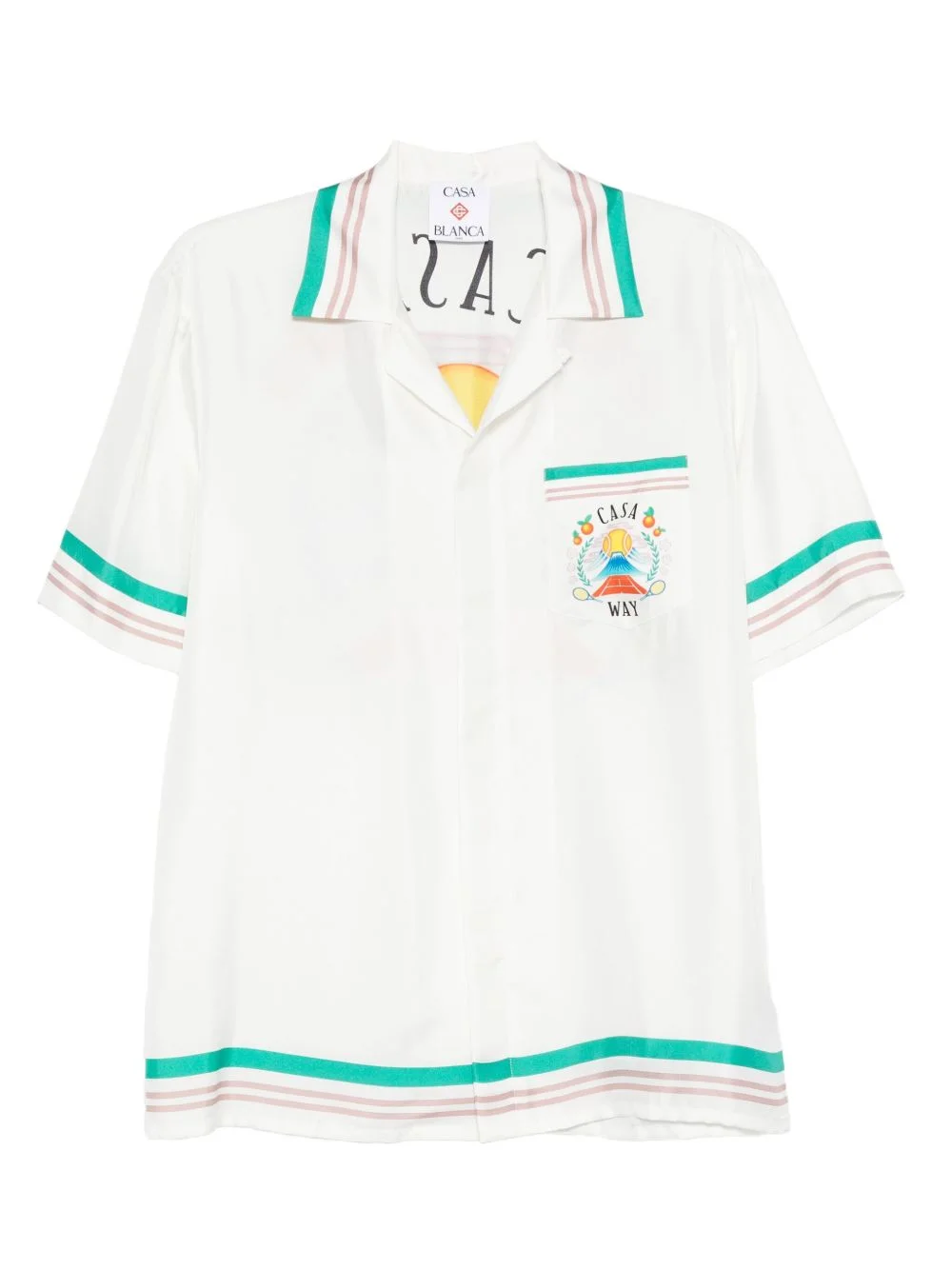 Casa Way stripe-detail shirt Highlights - Off-white - Short sleeves - Teal stripes - Pink stripes - Graphic print - Button fastening Made in Italy Composition Silk 100%