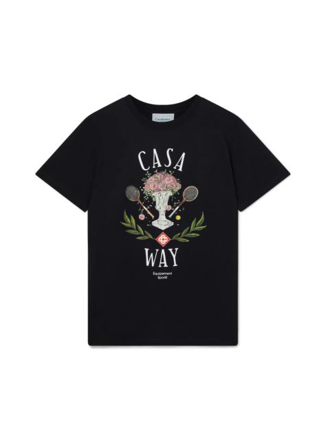 The Casa Way screen-printed organic cotton t-shirt features a seasonal take on our signature Casa Way artwork. Completed with a classic crewneck, short sleeves and Casablanca Paris branded label, designed for a relaxed fit. 100% organic cotton Colour: white Delicate machine wash Made in Portugal Fits true to size, take your regular size