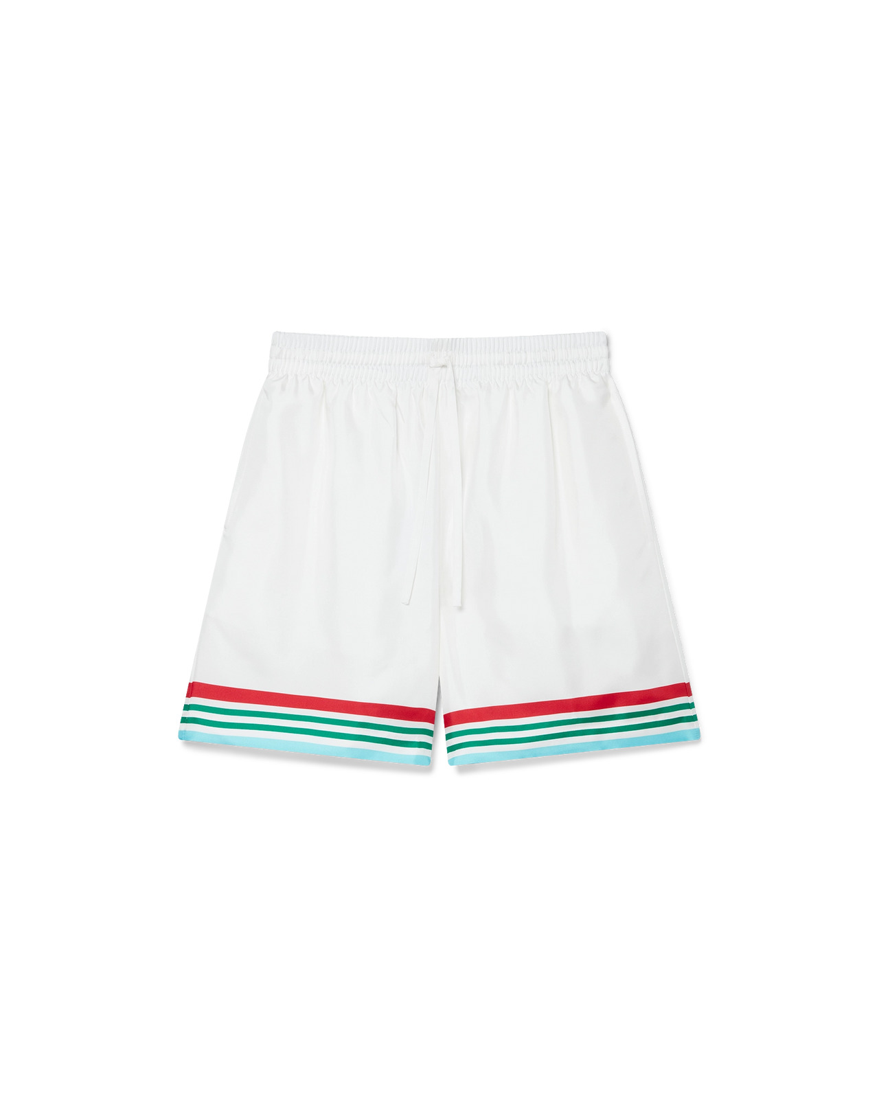 The Casa Way World Series silk shorts are a classic design crafted from silk twill fabric featuring the season's Casa Way World Series, reinterpreting the classic all-American baseball insignia for Casa Way Tennis. Completed with an elasticated waistband, drawstring fastening, in-seam side pockets, stripe hem and pocket detail, and a back patch pocket. - Silk twill fabric - Main: 100% silk - Lining: 100% polyester - Colour: white multicolour - Specialised dry clean only - Made in Italy - The model is 187cm/6'1 and is wearing a size M