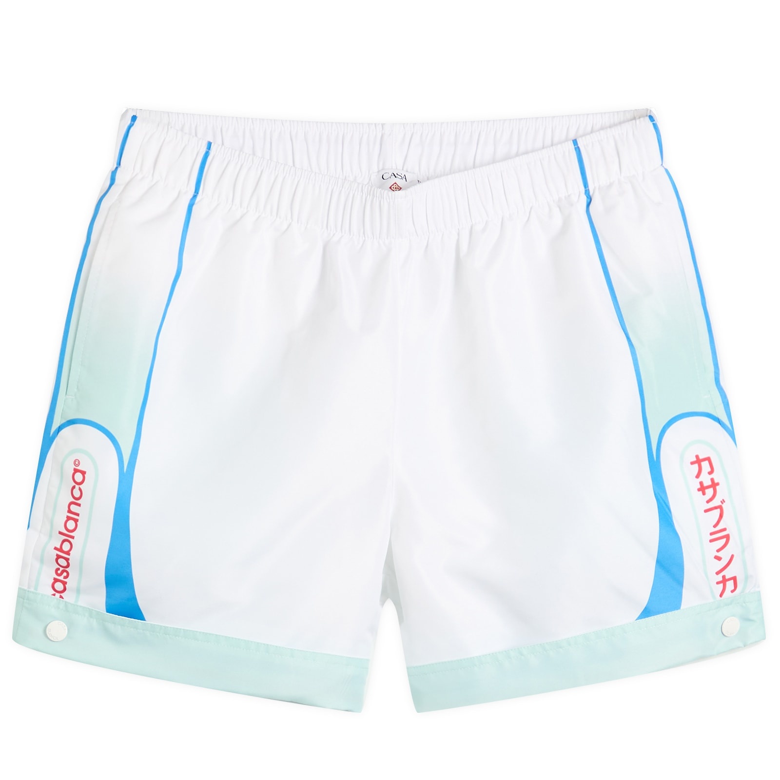 Whether you're jetting off to warmer shores or enjoying a staycation, these Fuji swim shorts from Casablanca are ideal for days by—and in—the water. Designed for comfort and quick drying, they feature printed branding and a fresh colour palette perfect for summer. - 100% Polyester - Fully Lined - Elasticated Waistband - 2 Side Pockets - Printed Branding - Made in Portugal - Product Code: MPF25-SWM-065-01
