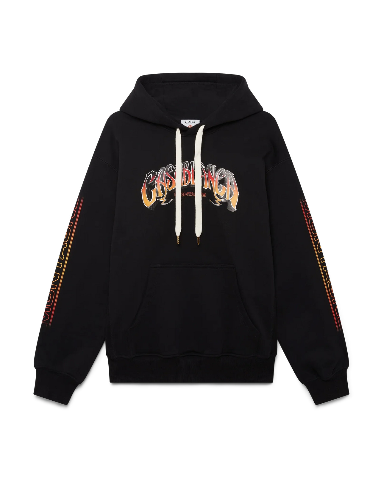 The ski hoodie is a refined apres-sport design crafted from organic cotton loopback jersey in black, inspired by minimalist aesthetics of Japan's rural mountain retreats. Drawing from stark beauty of bare winter trees and traditional countryside architecture, the design embodies sport-leisure codes. Featuring the Montagne print on the sleeves in an explosive orange gradient. - Cotton loopback jersey fabric - Composition: 100% organic cotton - Colour: black - Delicate machine wash - Made in Portugal - Relaxed fit - The model is 187cm/6'1 and is wearing a size M - Exclusive to casablancaparis.com, Paris Flagship store and selected retailers