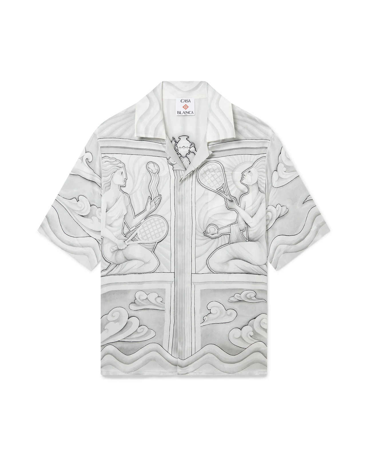 The sacred stone silk shirt is a short-sleeve all-over printed design crafted from silk satin fabric, featuring the house's seasonal artwork inspired by the stone effect of Trompe l'oeil with light drawings. Completed with a Cuban collar, button closure, interlocking CC logo corozo buttons - Silk satin fabric - 100% silk - Sacred Stone print - Specialised dry clean only - Made in Italy - Fits true to size, take your regular size - The model is 187cm/6'1 and is wearing a size M