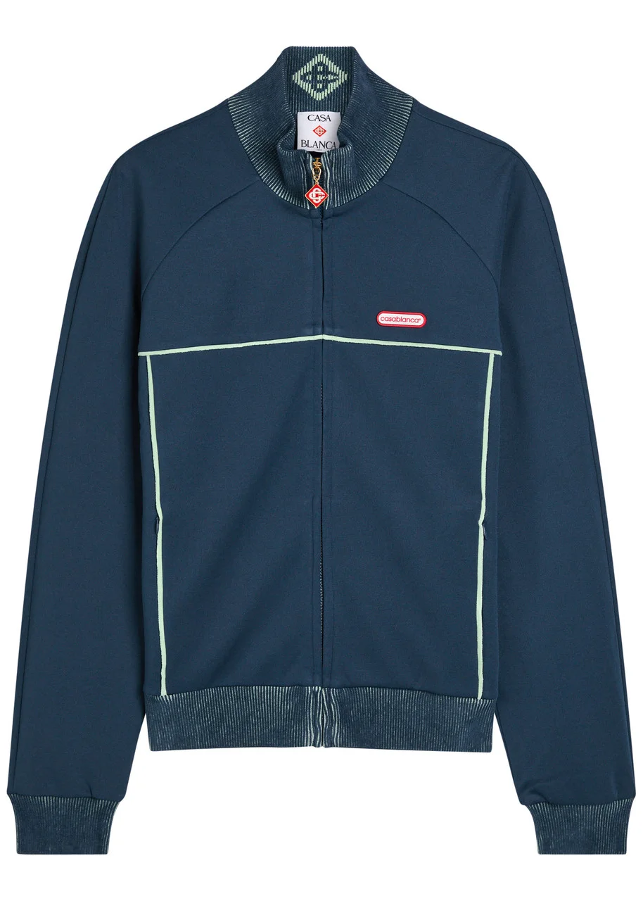 Info & Care Casablanca jersey track jacket High-neck, raglan sleeves, rubber designer plaque at chest and back, contrasting piped details, ribbed trims, fully lined Zip fastening through front 54% polyester, 46% cotton; lining: 100% polyester Dry clean Size & Fit Length shoulder to hem: 25 inches/ 63.5cm Midweight Boxy fit Model is 6'2"/ 188cm, chest size 38 inches and wears a size medium