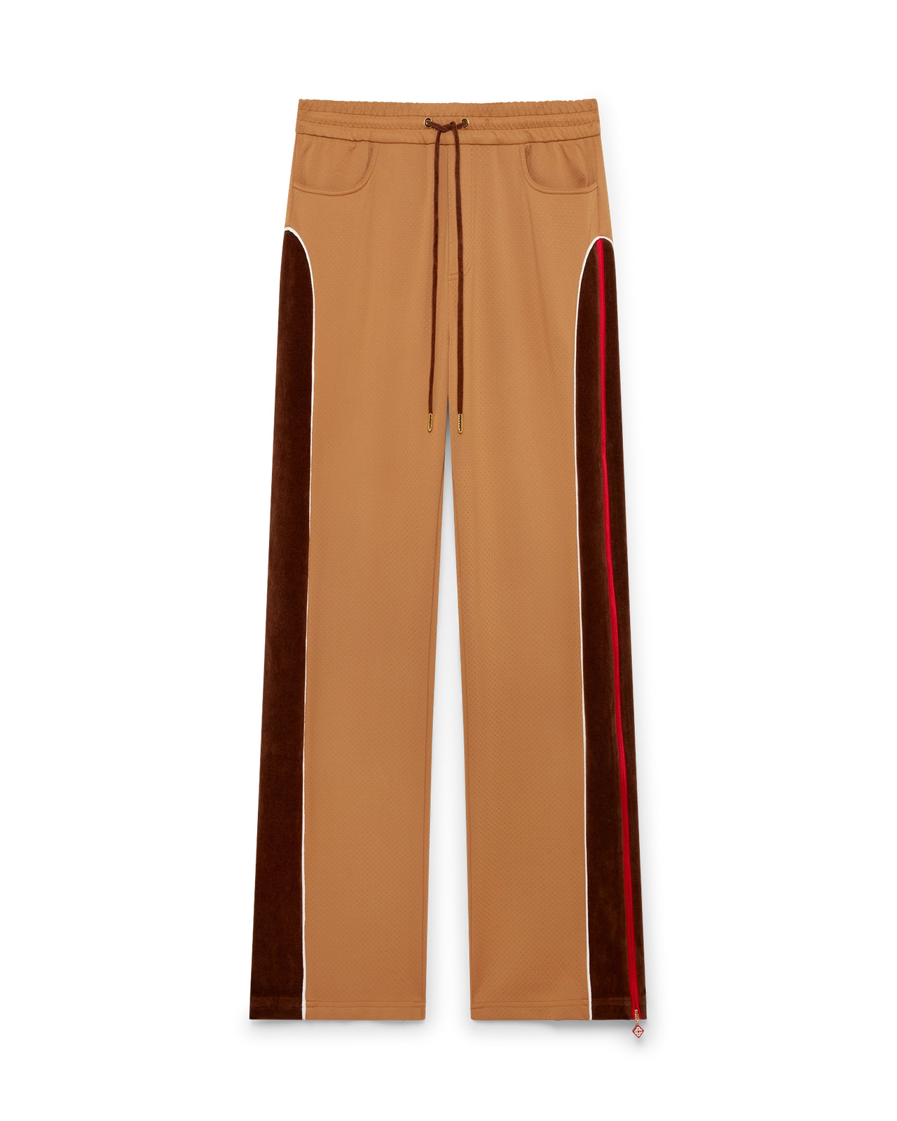 The Chenille panelled track pant is a sportswear-inspired design crafted from velour technical fabric and features the house's signature diamond logo on the zipper tab. Completed with an elasticated waistband, gold-tipped drawstring fastening, side panels with white piping details, front pockets, and a welt back pocket with zip closure. - Velour technical fabric - Main: 85% polyester 15% elastane - Lining: 100% polyester - Colour: beige brown - The model is 187cm/6'1 and is wearing a size M