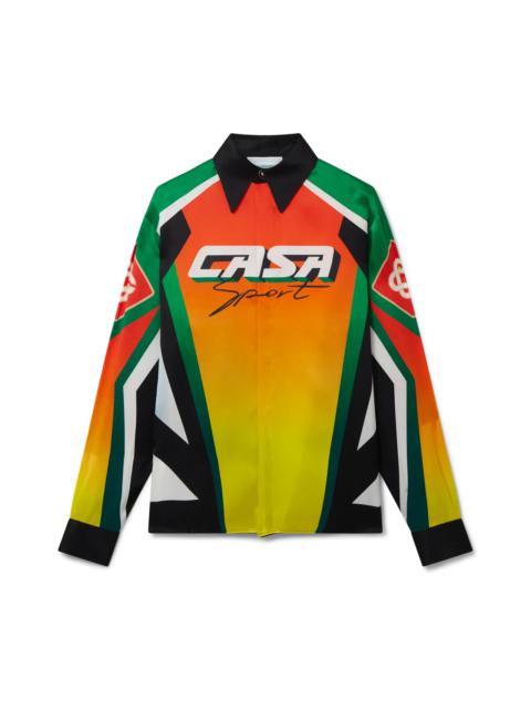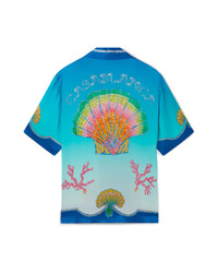 The Coquillage Coloré silk shirt is a short-sleeved all-over printed style featuring the gradient mosaic rainbow shell on a familiar blue ombre silk twill fabric. Completed with front button closure, open Cuban collar, breast pocket and contrast detail on the collar, cuffs, and hem. Printed silk twill fabric 100% silk Coquillage Coloré print Cuban collar Specialised dry clean only Made in Italy Fits true to size, take your regular size The model is 187cm/6’1 and is wearing a size M
