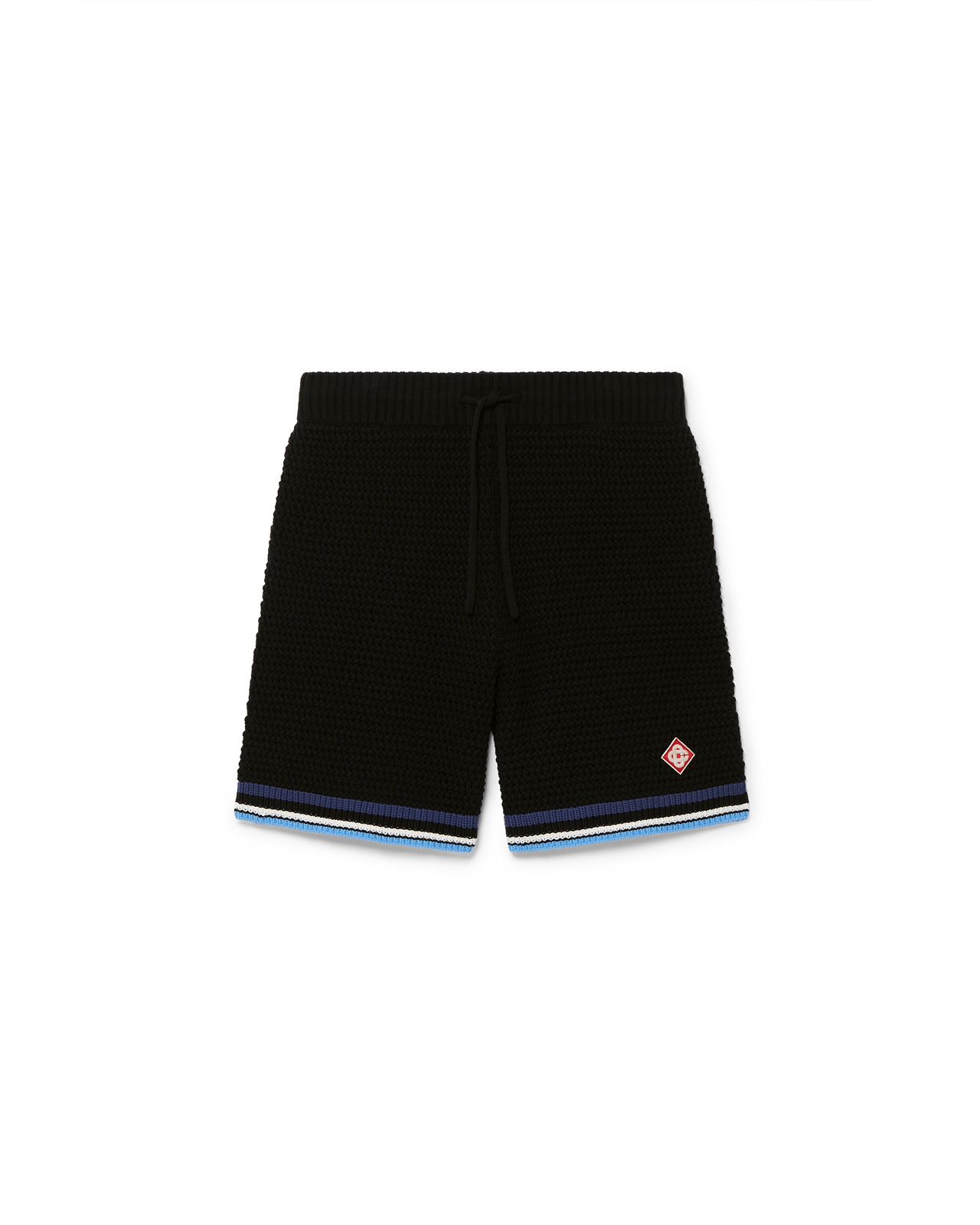 The crochet sporty shorts are a soft textured design crafted from knitted cotton fabric, featuring the house's signature diamond logo. Finished with a ribbed elasticated waistband with drawstring fastening, side pockets, and contrast stripe detail on the legs. - Crochet cotton fabric - Main: 100% cotton - Trim: 95% viscose 5% polyester - Colour: black/purple - Specialised dry clean only - The model is 187cm/6'1 and is wearing a size M - Exclusive to casablancaparis.com