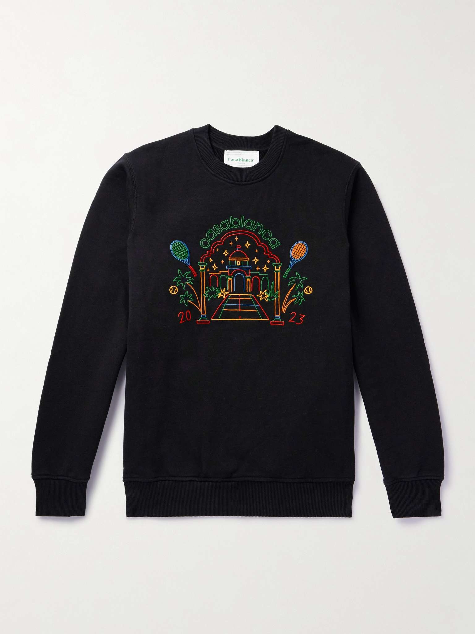 Rainbow colours bring Casablanca's embroidered 'Tennis Club' emblem to life on this sweatshirt – you'll recognise the logo and court against the majestic temple, but the rackets and balls are new additions. It's cut from organic cotton-jersey in a crew-neck shape. Size & Fit - Model wears a size larger to achieve a looser fit - Mid-weight, slightly stretchy fabric - Model is shown wearing a M - Model measures: chest 36"/ 92cm, height 6'1"/ 185cm Details & Care - Black cotton-jersey - 100% organic cotton - Machine wash - This item has been imported