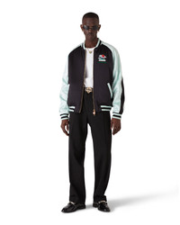 The embroidered satin bomber jacket is a traditional bomber-style jacket featuring iconographies used throughout previous collections, crafted from virgin wool and leather with Greek letter embroidery featuring Ancient Greek influence intertwined with futuristic elements and the house's signature design elements such as the Laurel leaf artwork, a tennis racket and ball, and oranges, and an Olympic torch. Completed with seasonal motifs of Ancient Greece, button closure with gold-plated branded hardware, a rib stand up collar, cuffs and hem with stripe detail. - Satin fabric - Main: 100% viscose - Lining: 100% viscose - Colour: black mint - Specialised dry clean only - Made in Portugal - The model is 187cm/6'1 and is wearing a size M