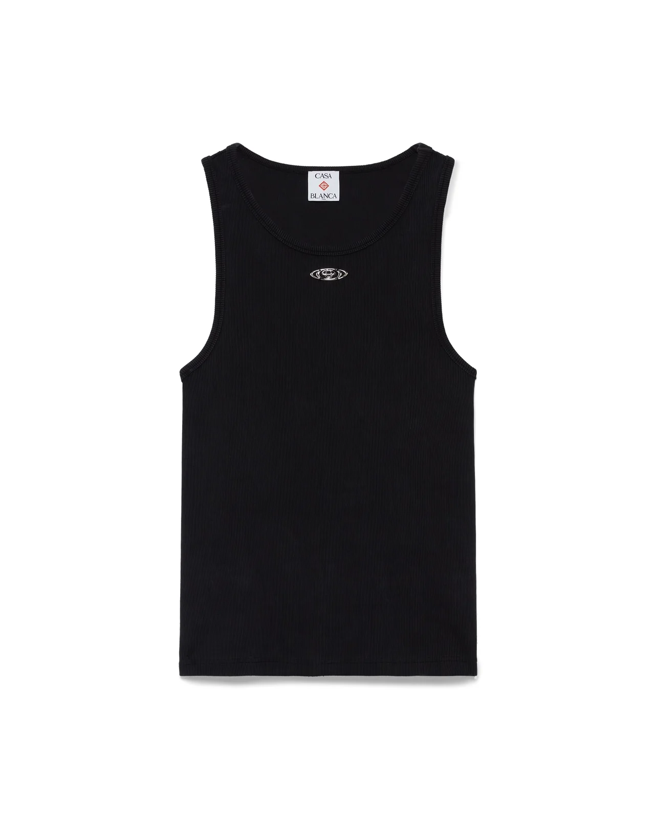 The Faded Ribbed tank top is a sleeveless design featuring the house's warped logo at its centre. Completed with a scoop neck and ribbed neck and armholes. - Faded ribbed cotton fabric - 98% organic cotton 2% elastane - Colour: faded black - Delicate machine wash - Made in Portugal - Slim fit - The model is 187cm/6'1 and is wearing a size M