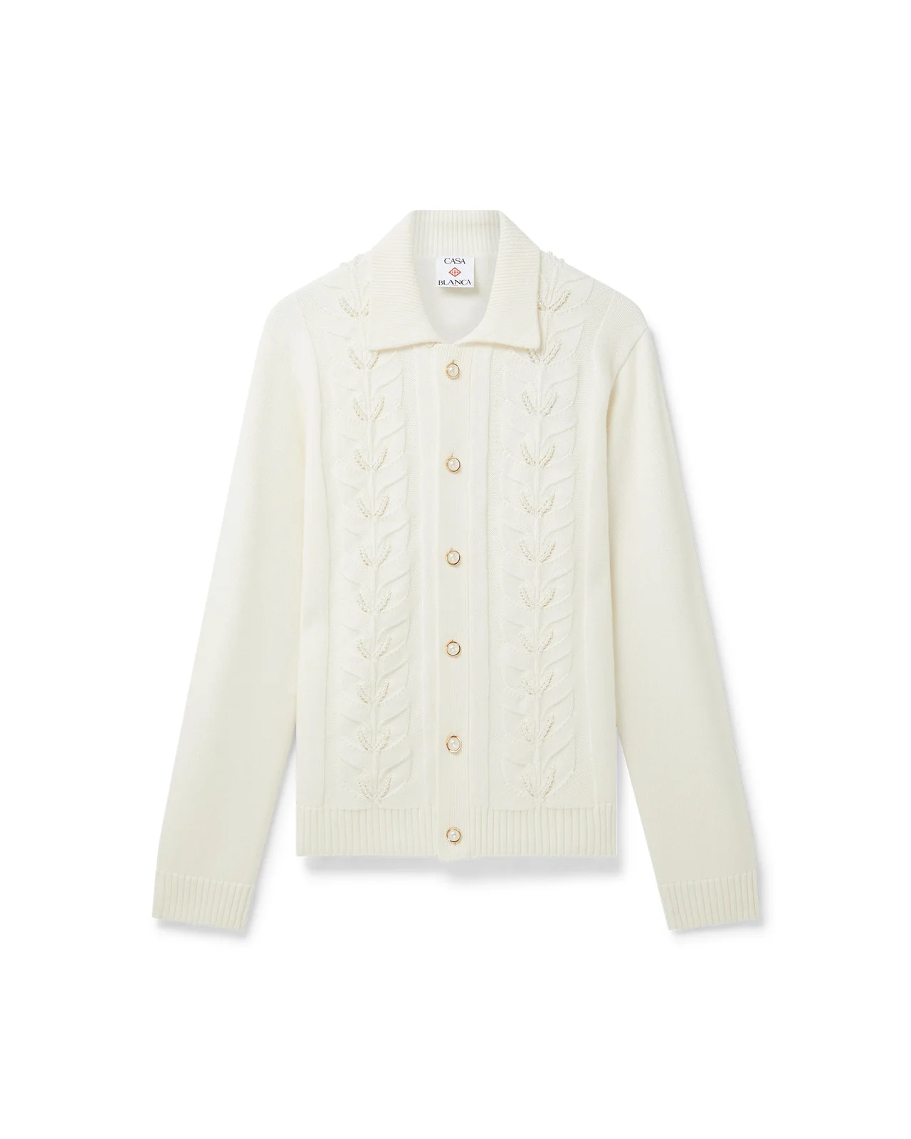 The Laurel knit cardigan is a long-sleeve design crafted from knitted merino wool fabric. Completed with button closure, signature gold rim pearl buttons, the house's signature Laurel artwork down the front, and rib cuffs, collar, and hem details. - Merino wool fabric - 100% merino wool - Colour: white - Specialised dry clean only - The model is 186cm/6'1 and is wearing a size M