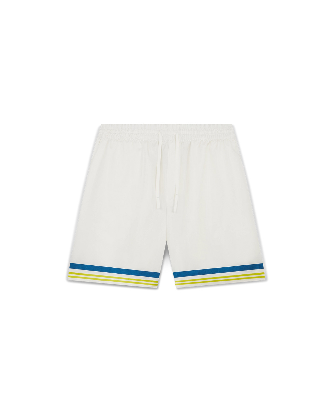 The Flaming Tennis Club Icon silk shorts are a printed design, featuring artwork of the house's distinctive tennis ball motif in flight, reflecting the fundamental balance of power, speed and control. Completed with an elasticised waistband, drawstring fastening, in-seam side pockets, and a back patch pocket. - Silk twill fabric - 100% silk - Flaming Tennis Club Icon - Specialised dry clean only - Made in Italy - Relaxed fit - - - - Exclusive to casablancaparis.com
