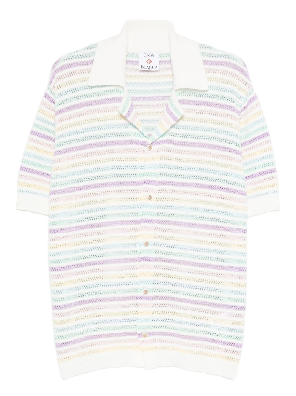 striped short-sleeve shirt Highlights - Off-white - Multi-colour stripes - Short sleeves - Button fastening - Camp collar - Open knit Imported Composition Cotton 100% SIZE & FIT Model measurements Height 6 ft 0 in(1.84 m) Bust/Chest 35.82 in(91 cm) Hips 37 in(94 cm) Waist 28.34 in(72 cm) Washing instructions Read Manufacturer Guidelines