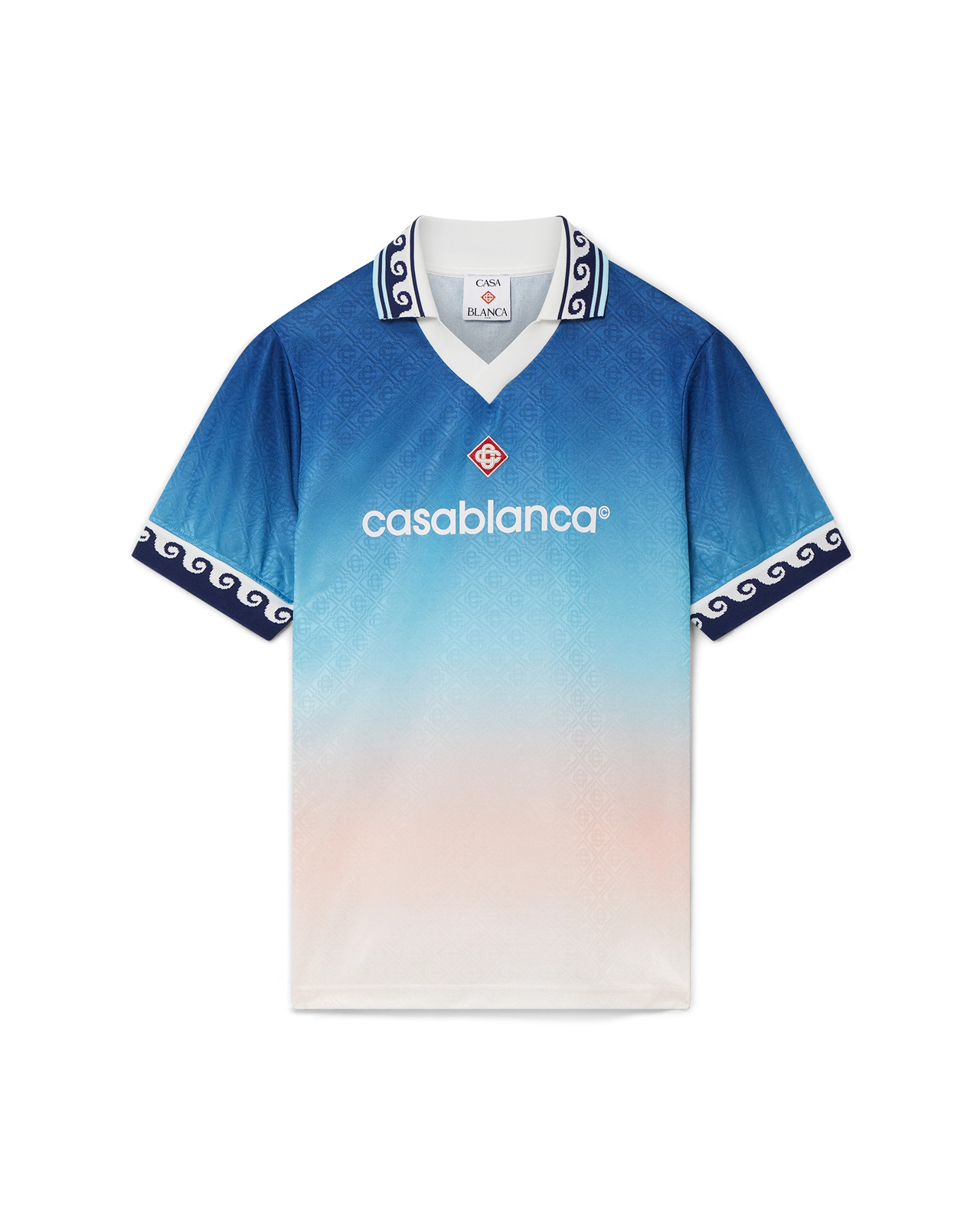 The Jacquard monogram football shirt is a short-sleeve sportswear design featuring the house's signature diamond monogram. Crafted from a gradient jacquard monogram fabric and completed with the house's signature diamond logo patch, a contrast rib collar, and a Casablanca logo across the chest. - Gradient jacquard monogram fabric - Main: 100% polyester - Casablanca front print logo - Diamond logo patch - Colour: blue gradient - Delicate machine wash - Made in Portugal - Fits true to size, take your regular size - The model is 185cm/6'1 and is wearing a size M