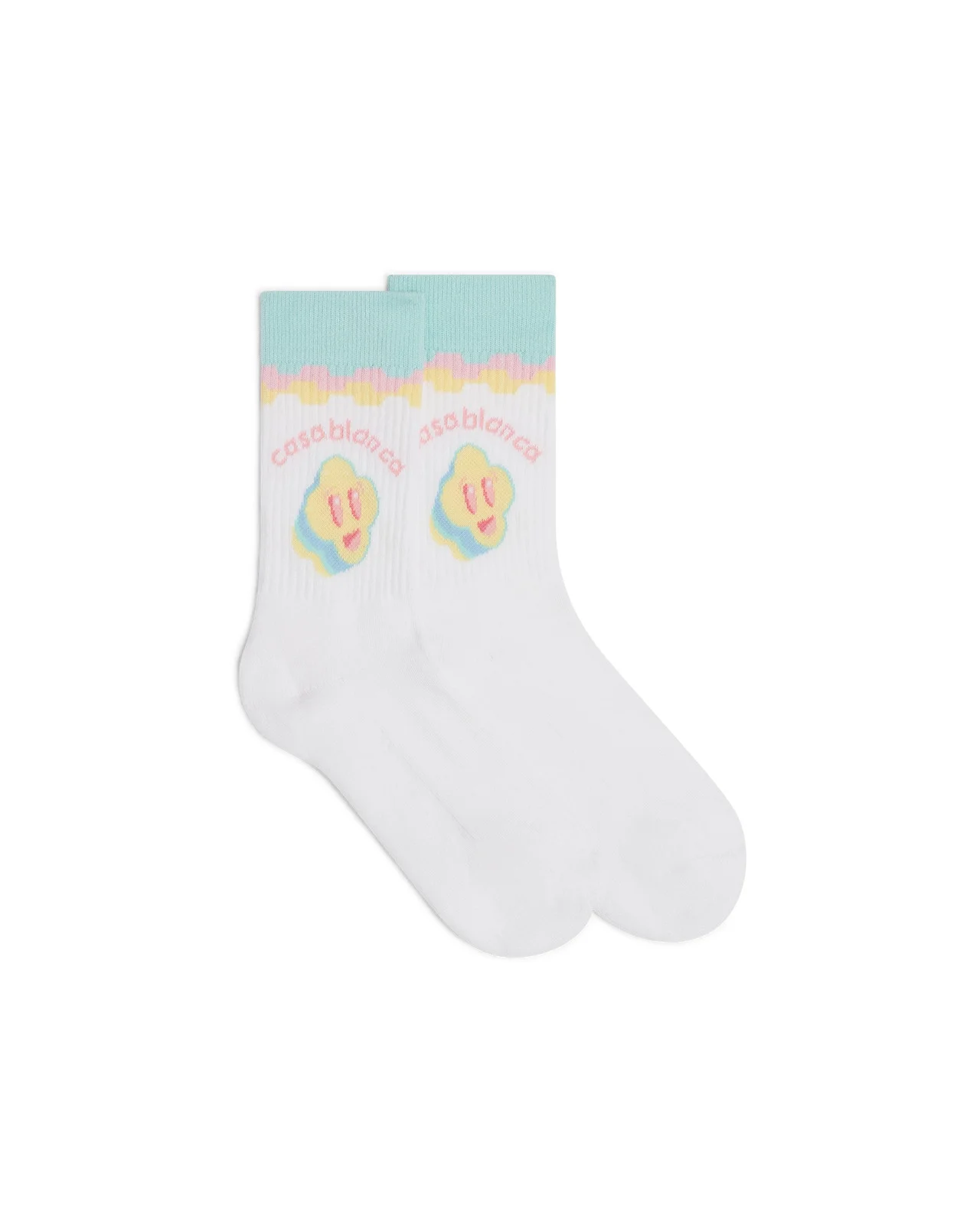 The For the Love of Dance socks are a refined design featuring the smiley face and its evolution as a graphic within the house music scene. Completed with a staggered stripe edge detail, the house's signature Casablanca logo, and rib legs. - Cotton blend fabric - 87% recycled cotton 12% polyamide 1% elastane - Colour: white - Delicate machine wash - Made in Portugal