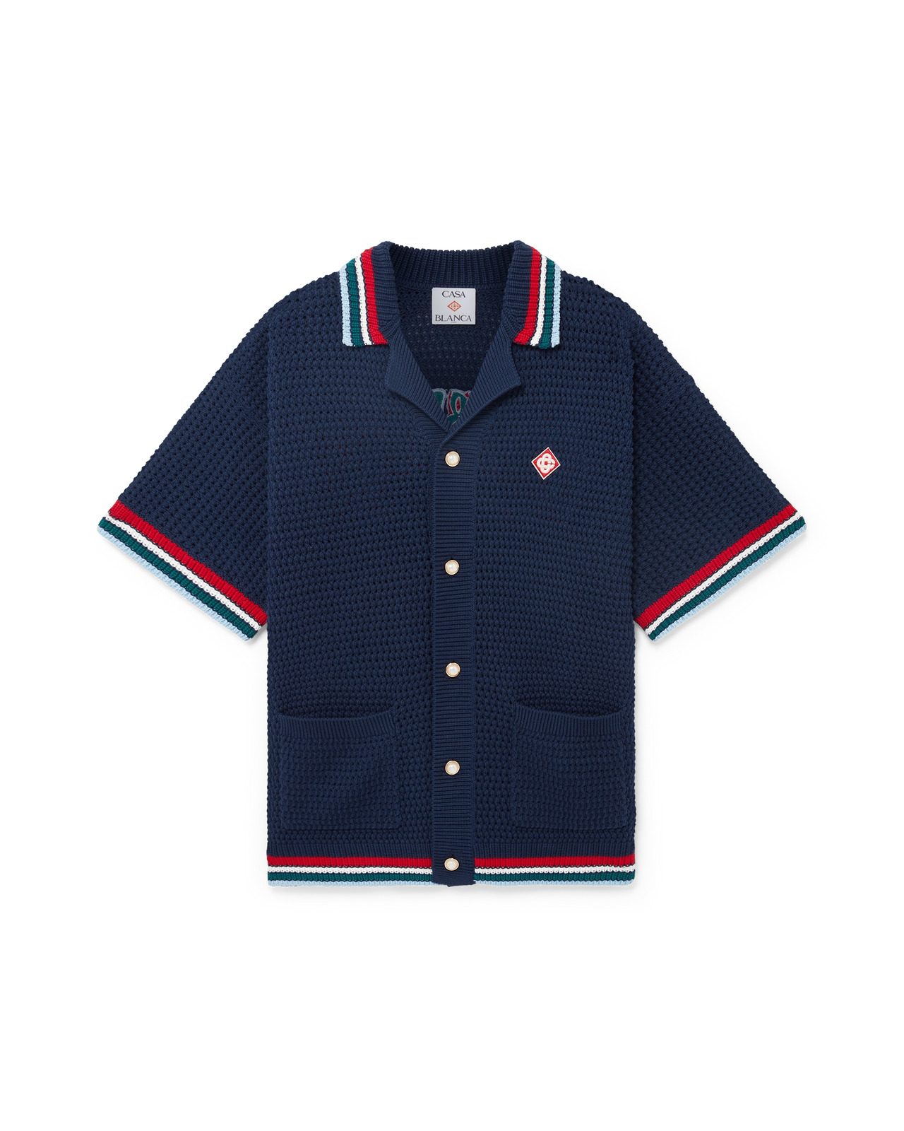 The Gothic crochet shirt is a short-sleeve knitted design crafted from crochet cotton fabric and features the house's signature diamond logo. Completed with signature gold rim pearl buttons, front patch pockets, and striped edge detail on the collar, cuffs and hem. - Crochet cotton fabric - Main: 100% cotton - Trim: 95% viscose 5% polyester - Colour: navy - Specialised dry clean only - The model is 186cm/6'1 and is wearing a size M - Exclusive to casablancaparis.com and selected retailers