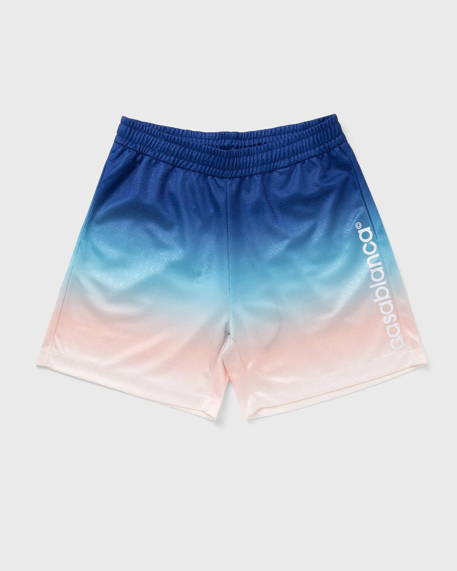 The Gradient Football Shorts are a sportswear design from Casablanca with a range of gradient colors that are characteristic of the label. They are made from a jacquard polyester fabric with a monogram and the signature Casablanca logo on the side. The style is rounded off with an elasticated waistband with drawstring and side slit pockets in the seam. - Jacquard fabric with monogram - Side pockets - Logo print Article number: MPS25-JTR-224-01 Gender: men Color: BLUE GRADIENT Material: 100% Polyester