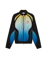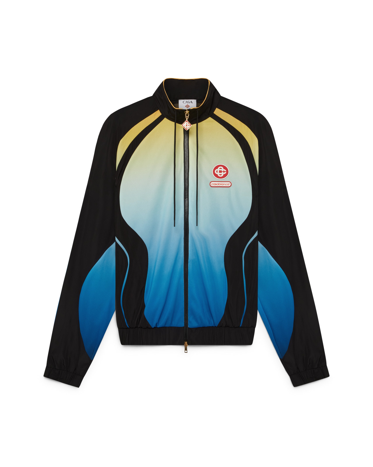 The gradient windbreaker jacket is a long-sleeve sportswear design featuring the house's signature interlocking CC logo and the Casablanca logo patch, in our tradition of reinterpreting natures powerful natural colour palettes - our seasonal gradient is inspired by the vivid and striking natural hues of poison dart frogs, the bold shades of blue to yellow signify a warning in nature, and used with the same attention-grabbing intention within our prints and sportswear styles, off set with deep black panelling in organic, fluid shapes that mimic the distinctive patterns found in these animals. Completed with a high collar with yellow piping detail, drawstring fastening, zip closure featuring the signature diamond logo zipper tab, elasticised cuffs and hem, and black panels. - Birdseye mesh fabric - Main: 100% polyester - Lining: 100% polyester - Colour: black/gradient multicolour - Specialised dry clean only - Made in China - The model is 187cm/6'1 and is wearing a size M