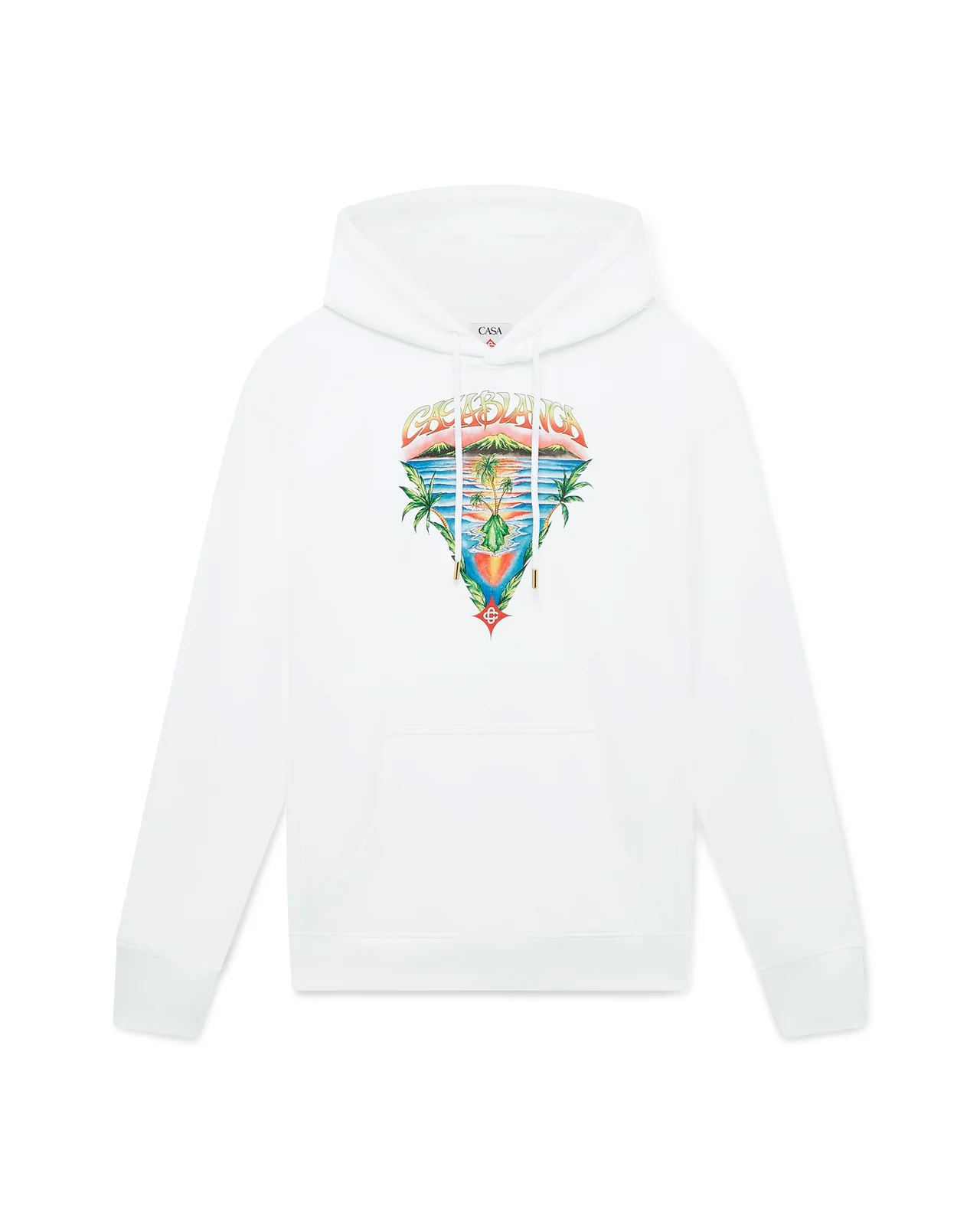 The Innocence Triangle hoodie is a luxury design featuring an ocean scene at sunset with an island in the centre, rendered in a style influenced by classic surf t-shirt art. The artwork captures the golden hour's ethereal beauty over tropical waters, presenting an idealised vision of beach paradise through the house's refined sport-leisure lens. Completed with an elasticised waistband, side pockets, and a relaxed silhouette that captures the brand's elevated sport codes. - Loopback jersey fabric - 100% cotton - Colour: white - Delicate machine wash - Made in Portugal - Relaxed fit - - The model is 189cm / 6'2 and is wearing size M - Exclusive to casablancaparis.com, and our Paris and LA flagship stores