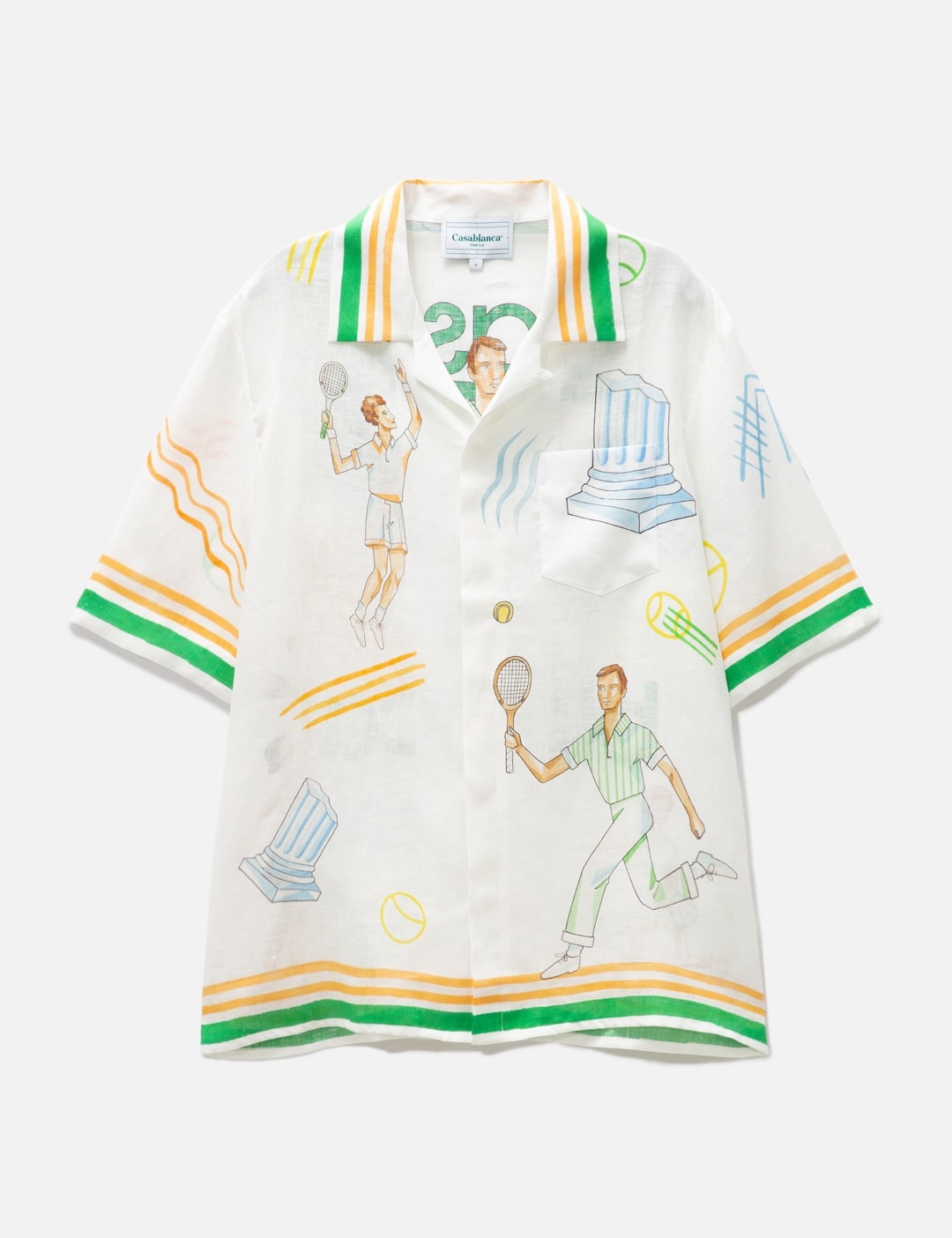 - Casablanca - Tennis Play Short Sleeve Linen Shirt - Cuban Collar - Short sleeve - Concealed button closure - Chest patch pocket - Straight hem - Color: Tennis Play Icon - Material: 100% Linen - See more Shirts and Clothing SIZING - Model wears size M - Model measures: Height 187cm, Chest 37”/96.5cm, Waist 30”/76.2cm, Hip 37”/94cm
