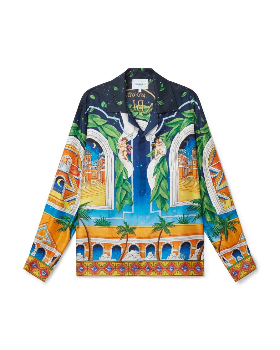 Men's Maison D'Ete long-sleeve silk shirt features a key print of the season in a daytime colourway of warm yellows, oranges and green. Finished with an open collar and closed collar fastening. Printed silk satin fabric 100% silk Maison D'Ete print multicolour Specialised dry clean only Made in Italy Fits true to size, take your regular size The model is 187cm/6’1 and is wearing a size M