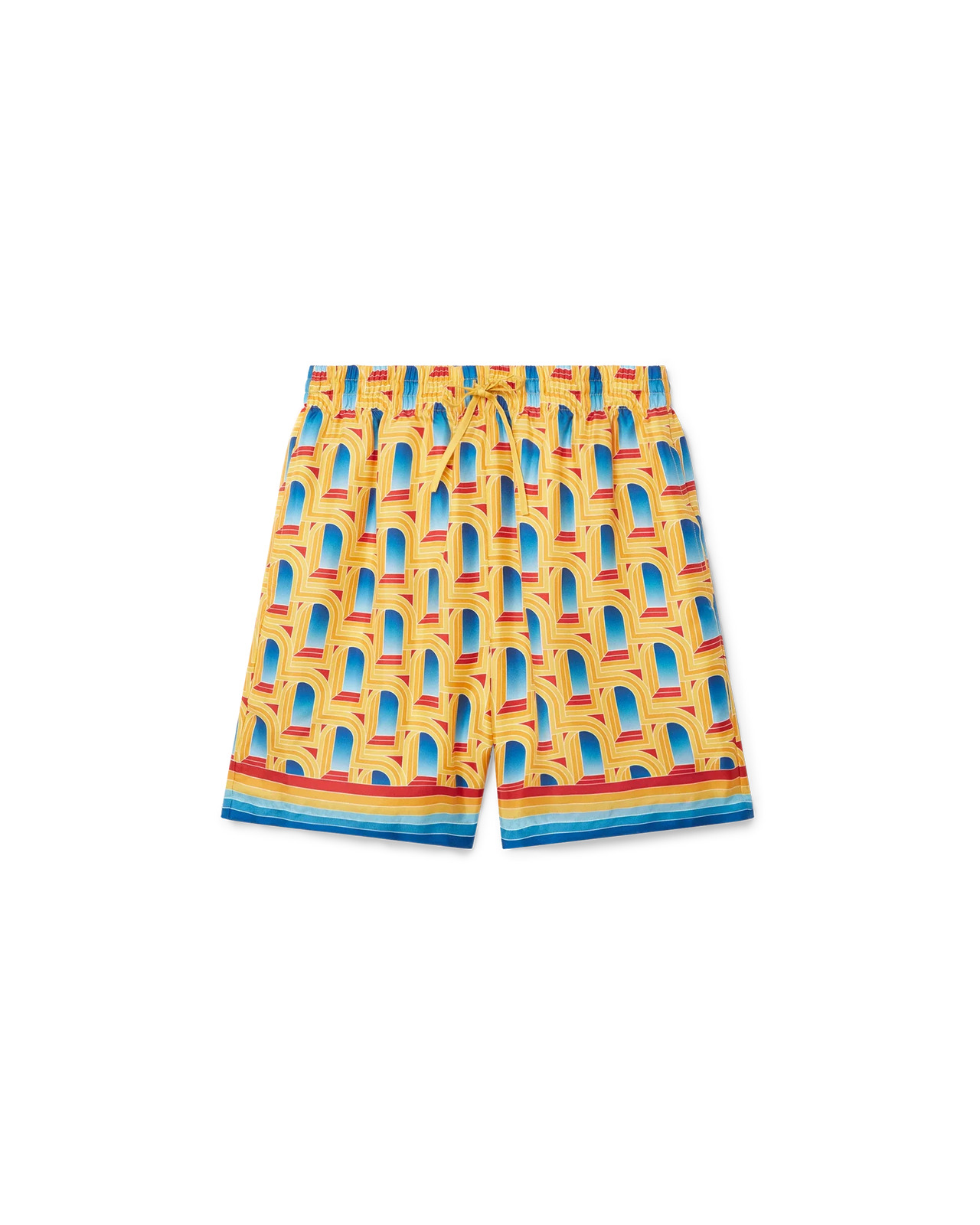 Men's L'Arche De Jour silk shorts feature the arch print of the season in a daytime colourway of warm yellows and oranges. Finished with tonal red and blue striped hem, and drawstrings. Printed silk satin fabric 100% silk L'Arche De jour print multicolour Specialised dry clean only Made in Italy Fits true to size, take your regular size The model is 187cm/6’1 and is wearing a size M