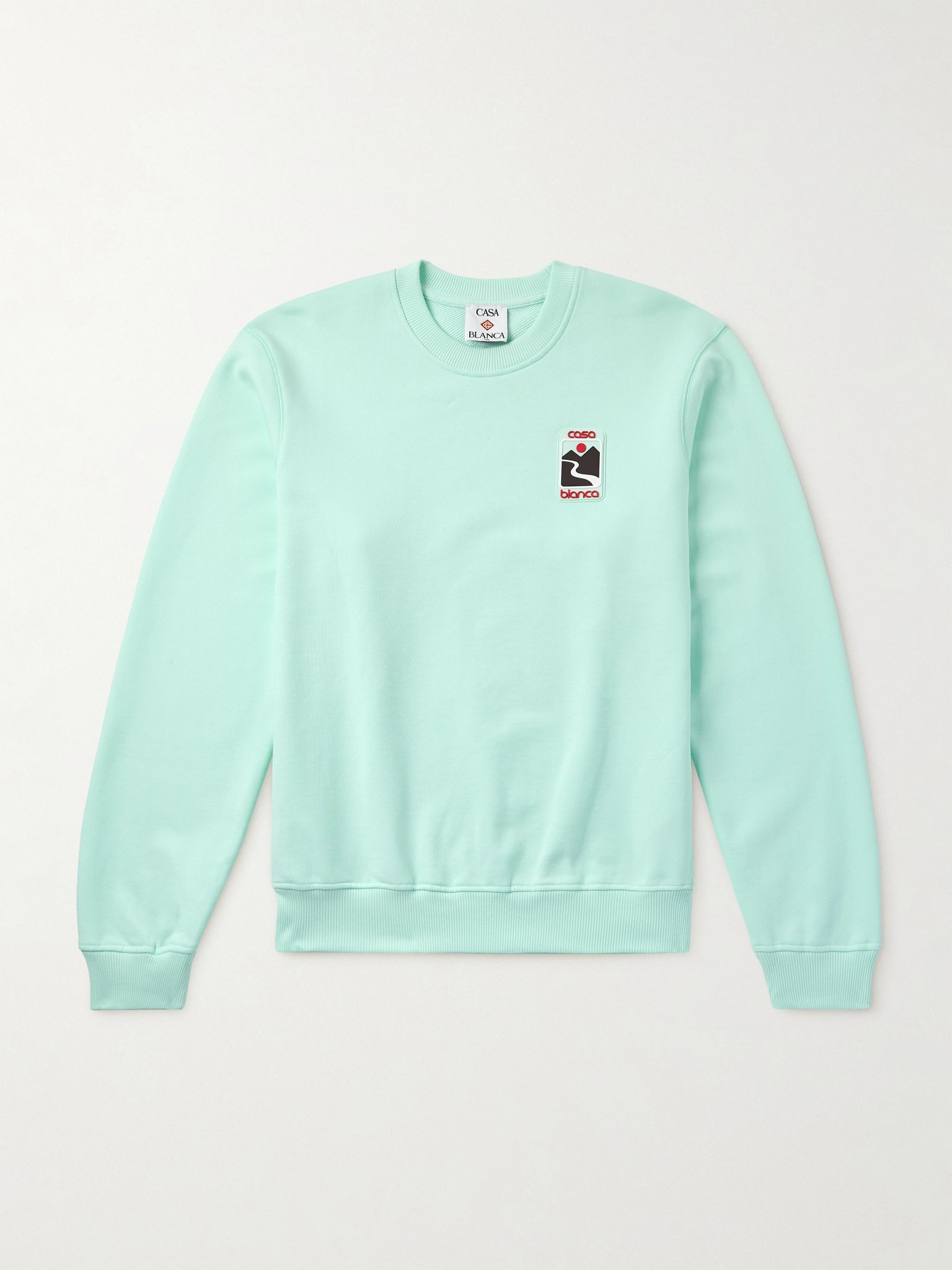 The applique on Casablanca's 'Sunset Valley' sweatshirt is a tribute to Japan's great outdoors and the country's iconic Hinomaru circle emblem. It's made from loopback organic cotton-jersey and has dropped shoulder seams for a more relaxed fit. Size & Fit - Fits true to size. Take your normal size - Designed for a relaxed fit - Mid-weight, slightly stretchy fabric - Model is shown wearing a M - Model measures: chest 38"/ 96cm, height 6'0"/ 183cm Details & Care - Mint-green loopback organic cotton-jersey - 100% organic cotton - Machine wash