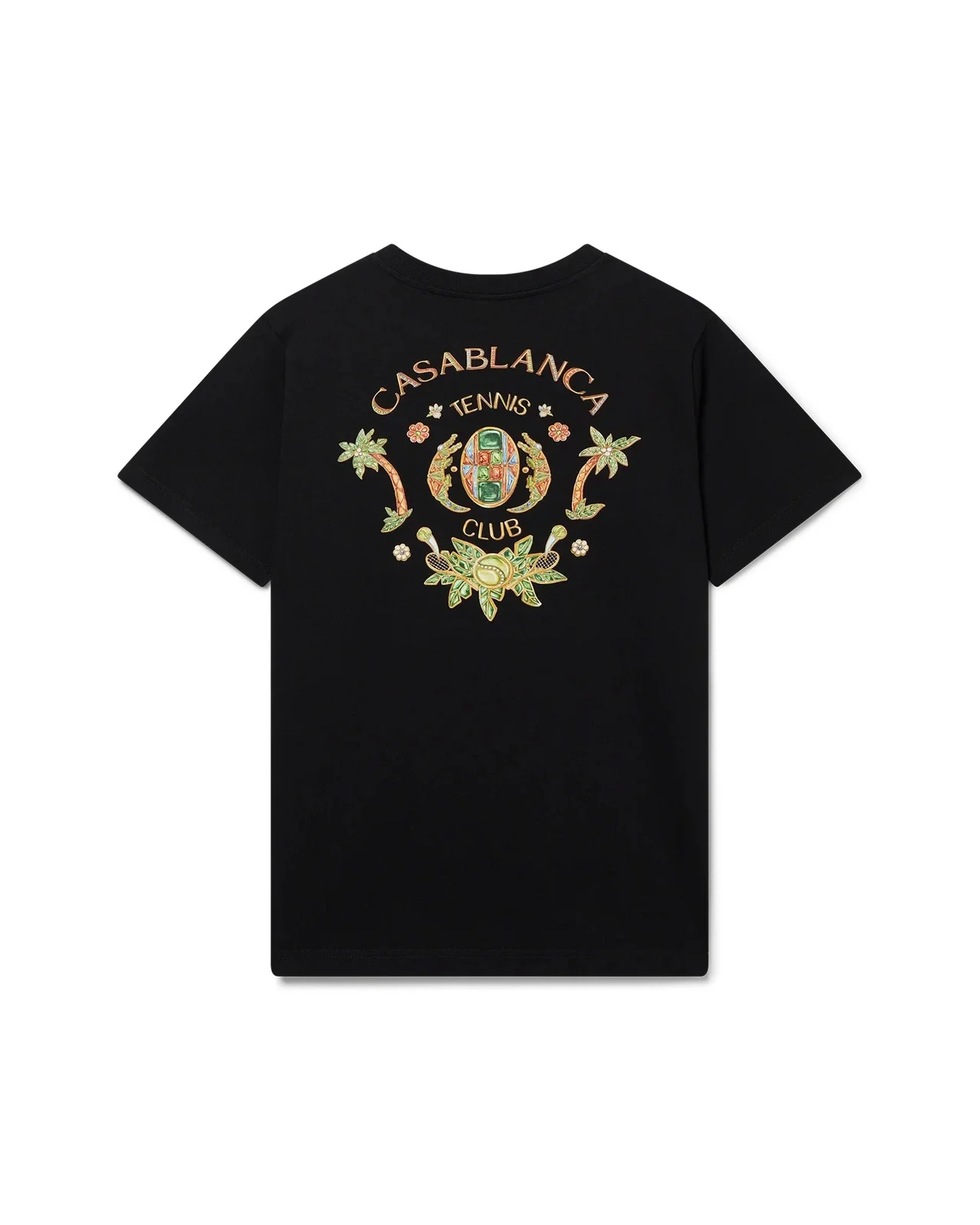 The Joyaux D'Afrique Tennis Club t-shirt is a short-sleeve printed design crafted from organic cotton and features the house's signature artwork reinterpreted for this season with a new take on our jewellery style blended with our traditional tennis club layout, with the elements being beautiful pieces of jewellery. Completed with a classic crew neck. - 100% organic cotton - Colour: black - Delicate machine wash - Made in Portugal - Unisex fit, take your regular size - The model is 186cm/6’1 and is wearing a size M - Exclusive to casablancaparis.com