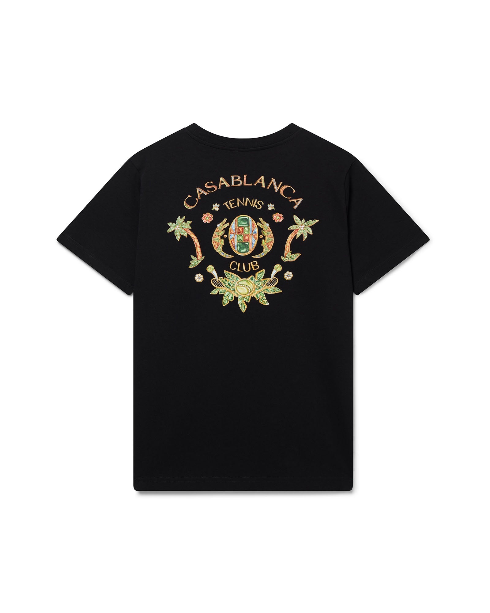 The Joyaux D'Afrique Tennis Club t-shirt is a short-sleeve printed design crafted from organic cotton and features the house's signature artwork reinterpreted for this season with a new take on our jewellery style blended with our traditional tennis club layout, with the elements being beautiful pieces of jewellery. Completed with a classic crew neck. 100% organic cotton Colour: black Delicate machine wash Made in Portugal Fits true to size, take your regular size Exclusive to casablancaparis.com