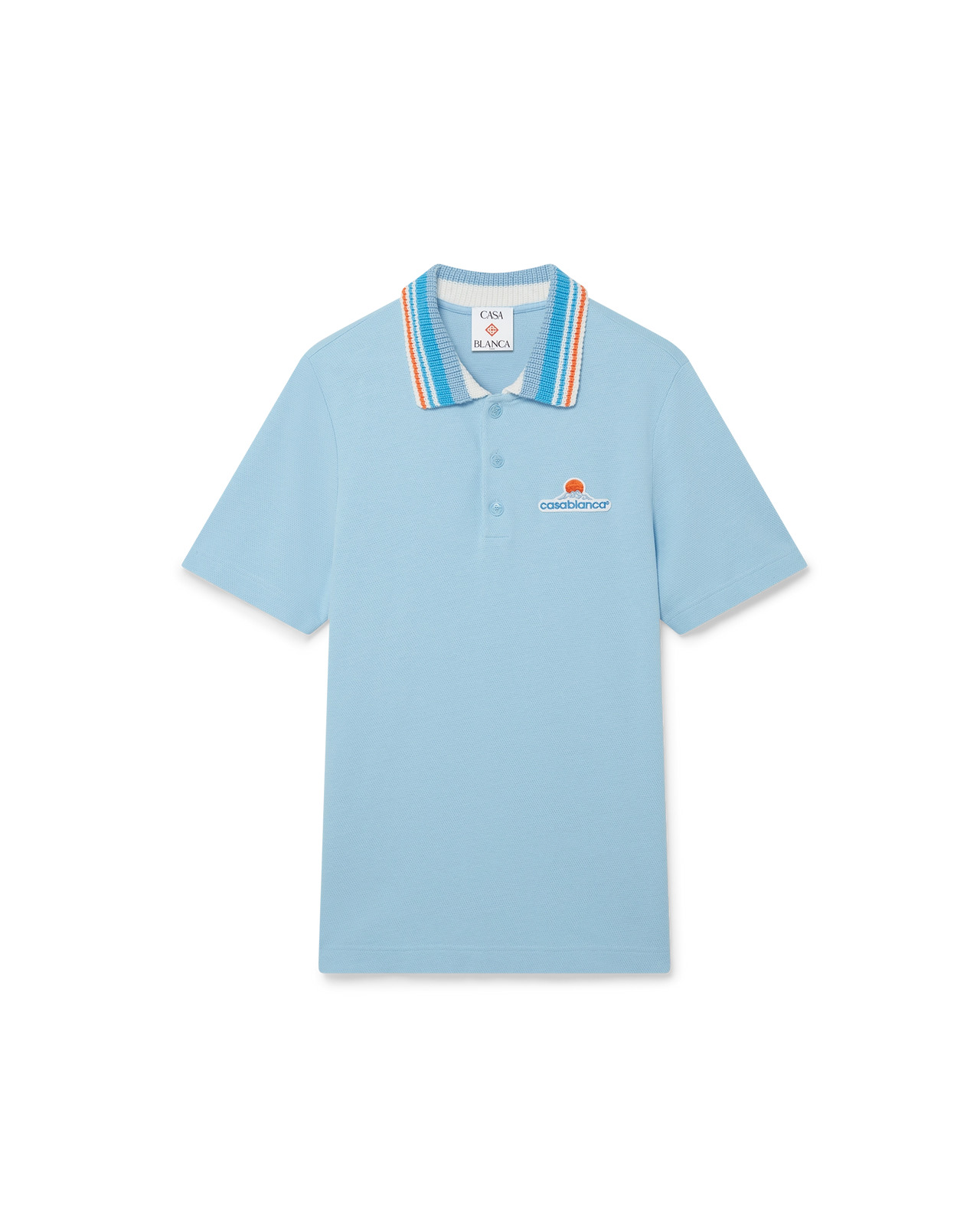 The knit pique short-sleeve polo shirt is a classic design featuring the Casa Montagne text logo - a logo that first looks like a mountain but as you look closer reads as Casa - crafted from organic cotton pique fabric. Completed with button closure, interlocking CC logo corozo buttons, and an orange, blue and white stripe knitted rib collar. - Cotton pique fabric - Main: 100% organic cotton - Contrast: 100% cotton - Colour: pale blue - Delicate machine wash - Made in Portugal - Relaxed fit - The model is 187cm/6'1 and is wearing a size M