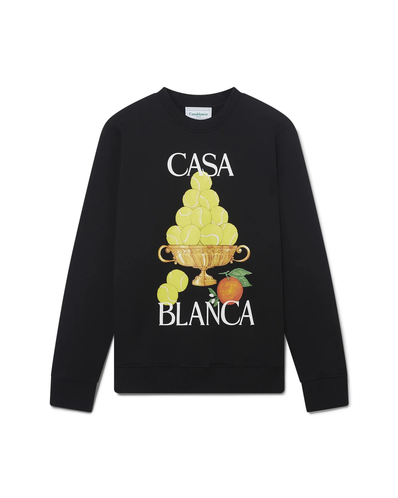 The La Corbeille D'Oranges sweatshirt is a long sleeve design crafted from an organic cotton fabric and features the house's iconographic orange pyramid artwork reinterpreted for this season. Finished with a ribbed collar, cuffs, and hem. - 100% organic cotton fabric - Contrast: 97% organic cotton 3% elastane - Colour: black - Specialised dry clean only - Made in Portugal - Fit true to size, take your regular size - The model is 187cm/6’1 and is wearing a size M - Exclusive to casablancaparis.com