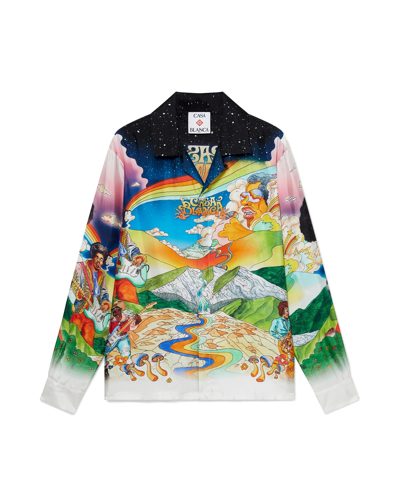 The La Musique silk shirt is a long-sleeve design crafted from a printed silk twill fabric featuring the season's artwork representing an ode to Bootsy Collins and iconic 70s funk records. Completed with a Cuban collar, a breast pocket, hidden button closure with interlocking CC corozo buttons, and a gold rim enamel button on each cuff. - Printed silk twill fabric - 100% silk - La Musique multicolour print - Specialised dry clean only - Made in Italy - The model is 186cm/6'1 and is wearing a size M