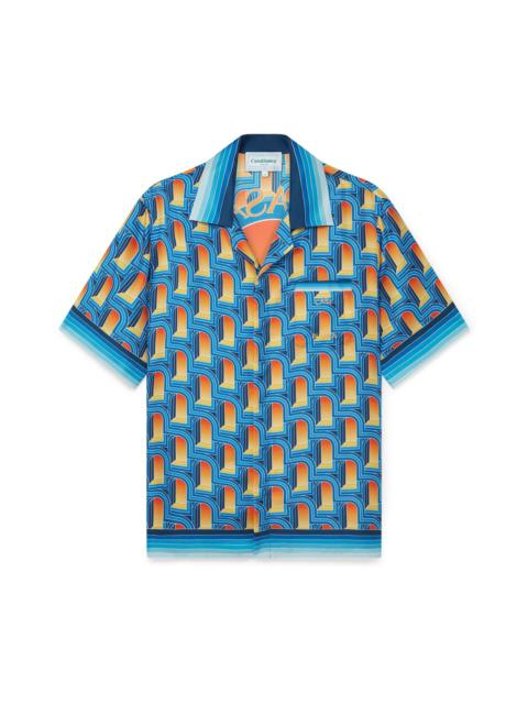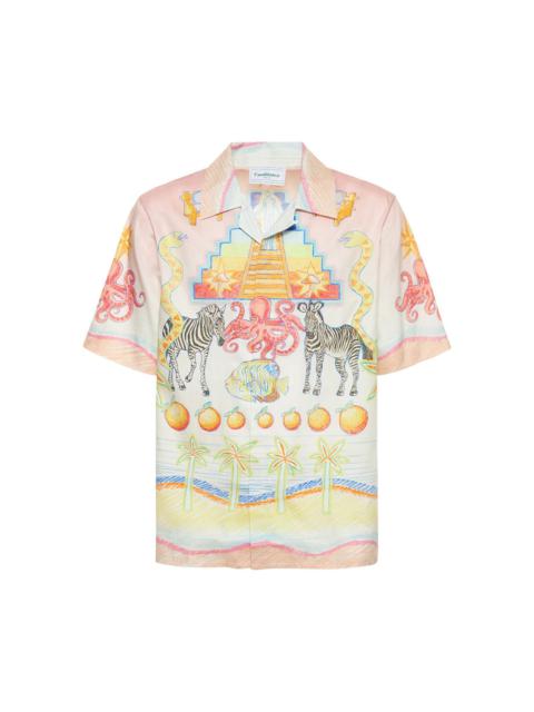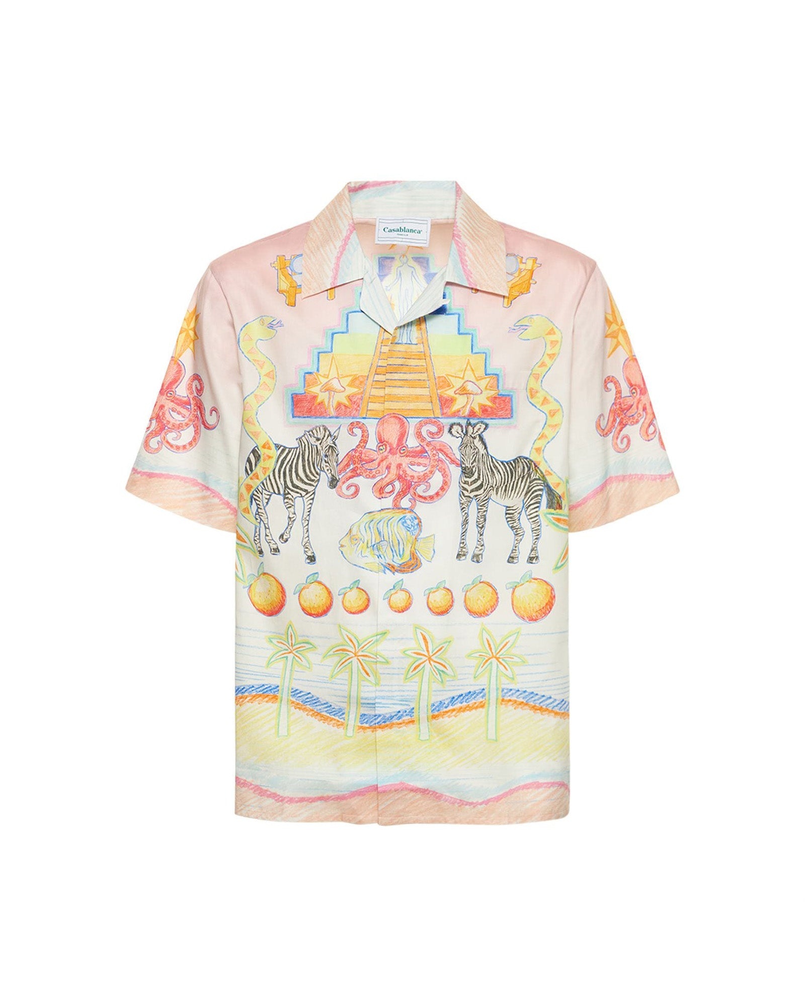 The L'Arbre De Vie cuban collar linen shirt is a printed short-sleeve style featuring an effervescent take on an evocative landscape scene inspired by Mexican artist Pedro Linares, fantasy creatures depicted in kaleidoscopic colours are a form of spirit animals. Finished with an intended open collar, Casablanca Paris branded label, front button closure and signature gold rim pearl buttons, designed for a relaxed fit. 100% cotton L'Arbre De Vie print multicolour Cuban collar Specialised dry clean only Made in Italy Fits true to size, take your regular size