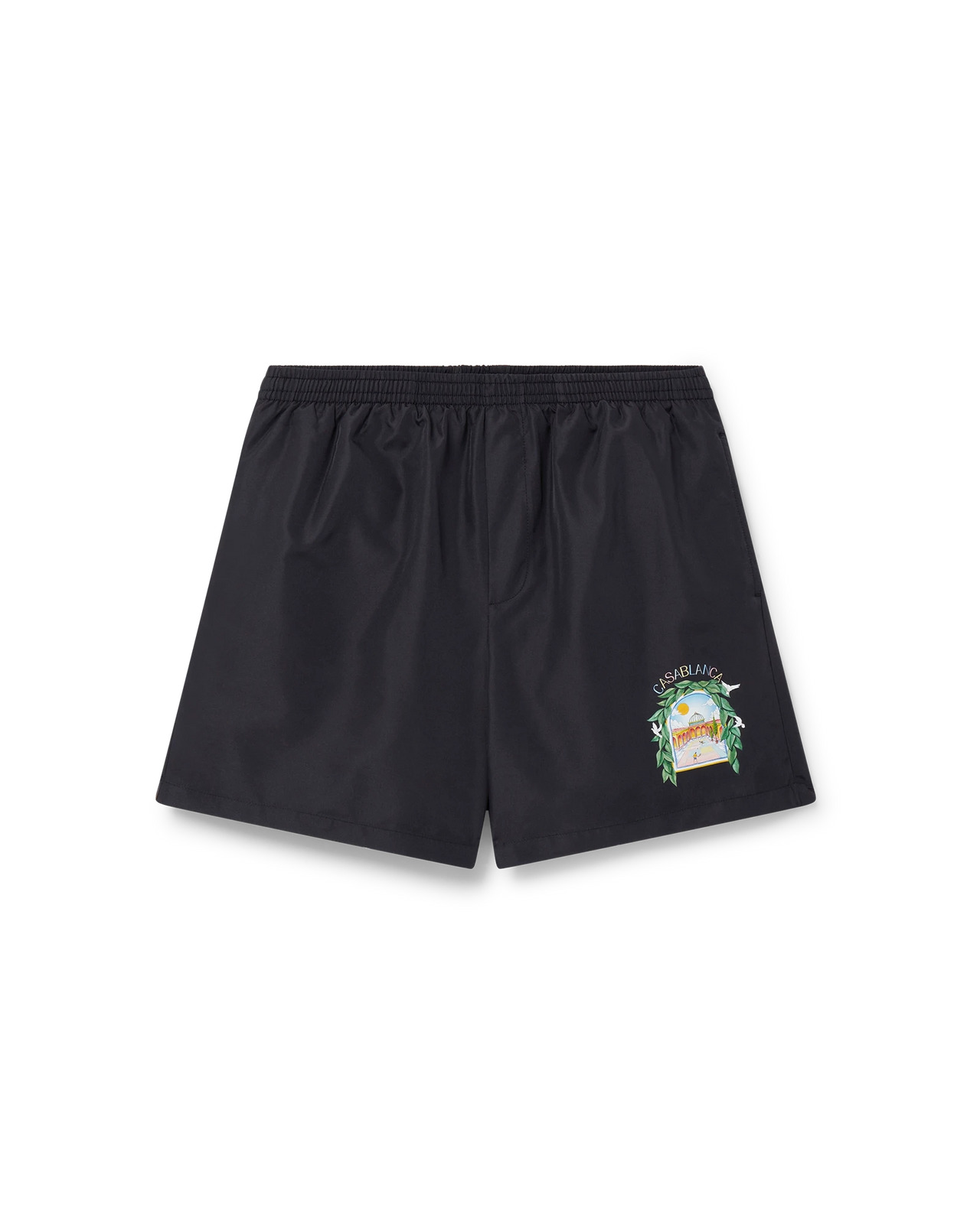 The L'Arche De Tennis swim shorts are crafted from a polyester fabric featuring the house's signature arch print reinterpeted this season. Completed with an elasticated waistband, gold-tipped drawstring fastening, in-seam side pockets and a back patch pocket. - Technical swim fabric - Main: 100% polyester - Lining: 80% polyester 20% elastane - Colour: black - Delicate machine wash - Wash and iron inside out, do not tumble dry - Made in Portugal - Fits true to size, take your regular size - - Exclusive to casablancaparis.com & flannels.com