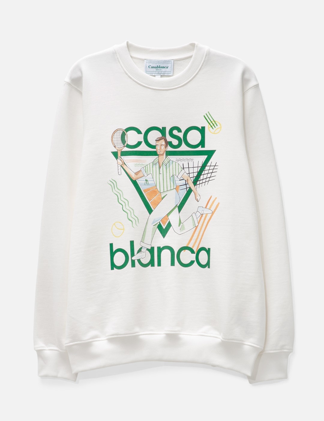- Casablanca - Le Jeu Sweater - Classic crewneck - Long sleeve - Iconographic artwork printed on the front - Ribbed collar, cuffs and hem - Color: White - Material: 100% Cotton - See more Sweatshirts and Clothing SIZING - Model wears size M - Model measures: Height 187cm, Chest 37”/96.5cm, Waist 30”/76.2cm, Hip 37”/94cm