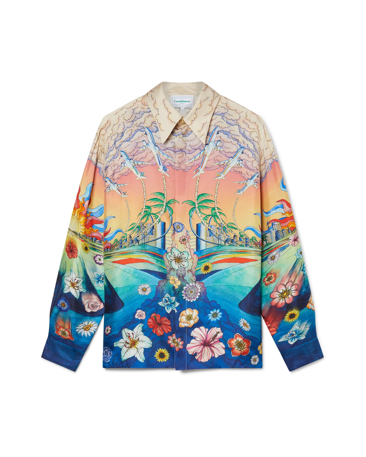 The L'Envol silk shirt is a printed long-sleeve style featuring Casablanca symbology with Arabic iconography. Finished with a collar, front button closure and signature gold rim pearl buttons, it has been designed for a classic fit. - Printed silk twill fabric - 100% silk - L'Envol print multicolour - Cuban collar - Specialised dry clean only - Made in Italy - Unisex fit, take your regular size - The model is 187cm/6’1 and is wearing a size M