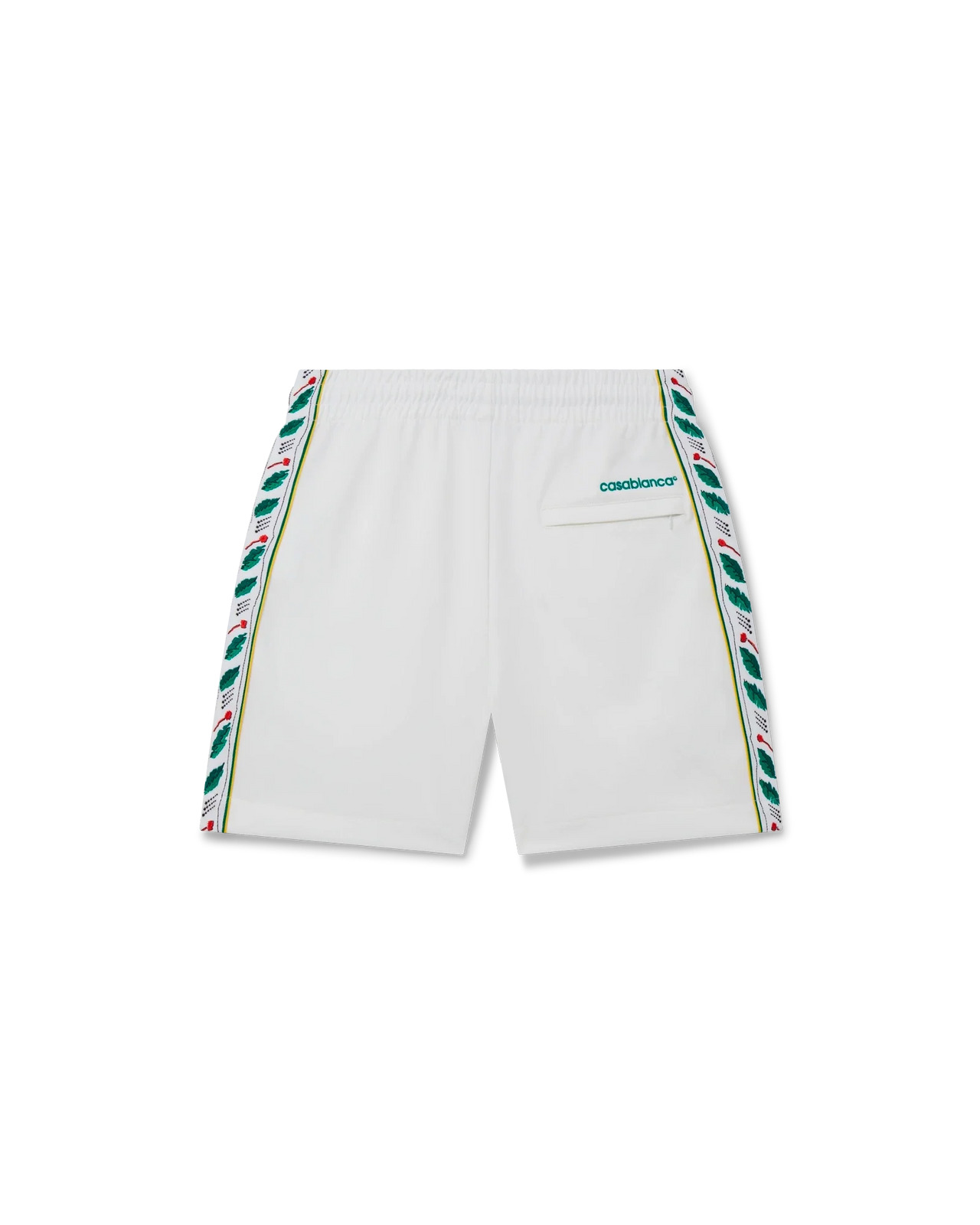 The Laurel track shorts are a sportswear design featuring the house's signature Laurel artwork on contrast ribbing with piping details down the sides. This piece is finished with a pin-tuck seam down the front, an elasticated waistband, internal drawstring fastening, in-seam side pockets, a welt back pocket with zip closure and a Casablanca logo. Tricot fabric 100% organic cotton Colour: white Delicate machine wash Made in Portugal Fits true to size, take your regular size The model is 186cm/6’1 and is wearing a size M
