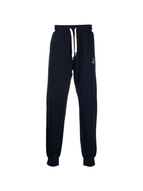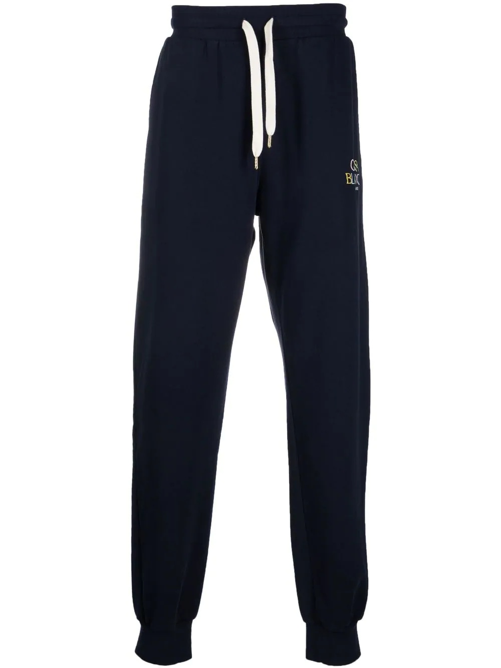 logo-embroidered track pants navy blue/multicolour organic cotton embroidered logo elasticated waistband two side slit pockets elasticated ankles Imported Composition Organic Cotton 100%, Polyester 100% SIZE & FIT Model measurements Height 6 ft 1 in(1.86 m) Bust/Chest 38.18 in(97 cm) Hips 38.18 in(97 cm) Waist 30.7 in(78 cm) FittingInformation This piece fits true to size. We recommend you get your regular size Designed to be loose over the leg with a fitted waist and hem Made with a mid-weight fabric