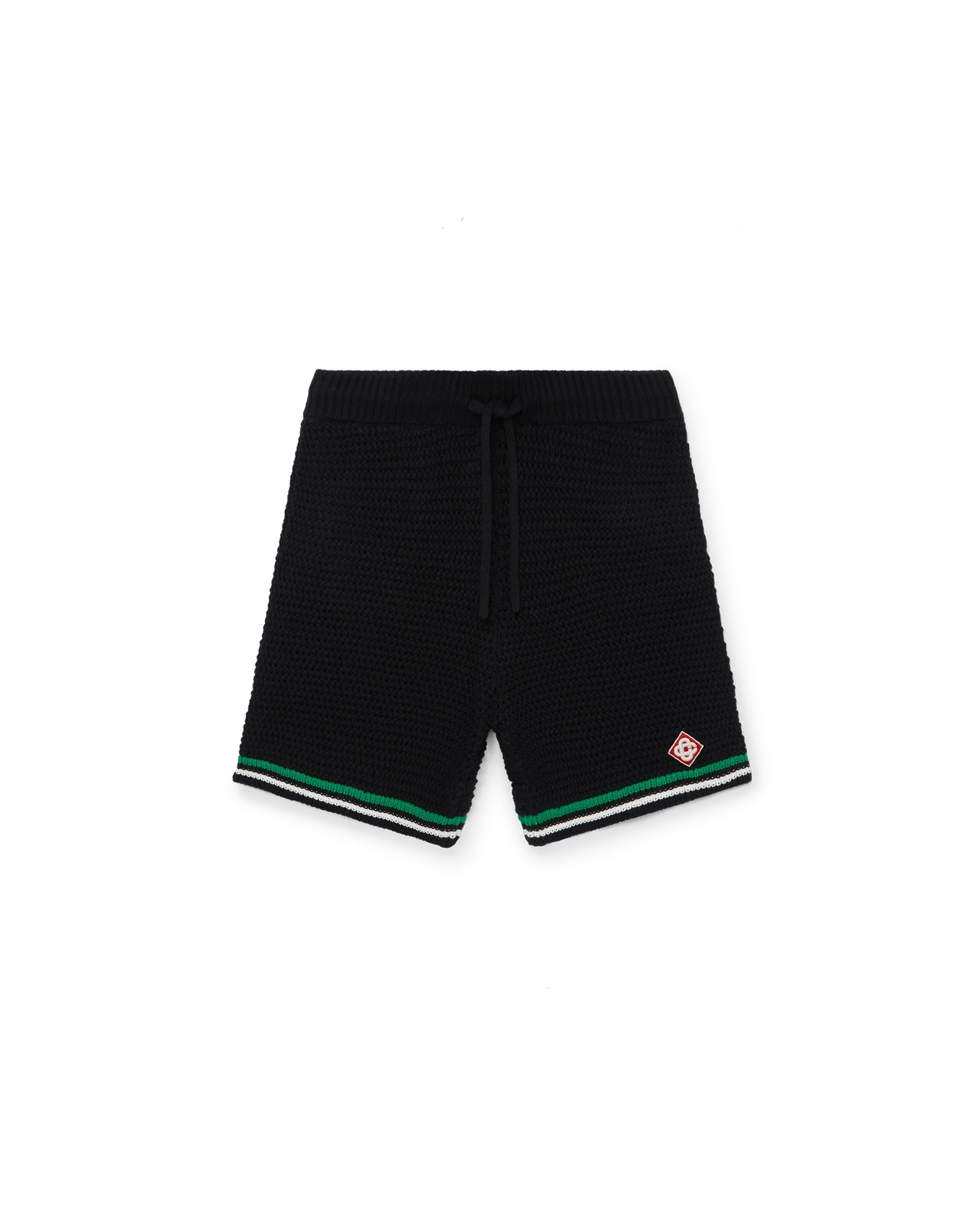 The crochet tennis shorts are a soft textured design crafted from a knitted cotton fabric, featuring the house's signature diamond logo. Finished with a contrast white rib elasticated waistband, drawstring fastening and edge detail, and green and white stripe detail on the hem. Crochet cotton fabric 100% organic cotton Colour: black Specialised dry clean only Fits true to size, take your regular size The model is 187cm/6’1 and is wearing a size M