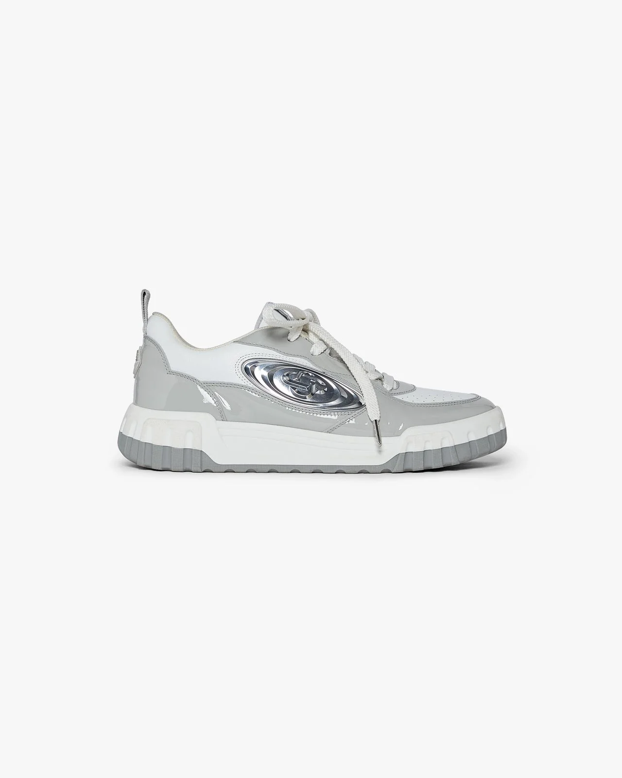 The men's Court silver sneaker is a refined design crafted from leather, featuring the house's warped logo on the side, reflecting the house's elevated approach to tennis-inspired footwear with a classic Court silhouette. Completed with Casablanca branding on the back and a rubberised sole. - Leather upper - Casablanca logo on heel - Woven Court tongue label - Colour: silver/white - Made in Portugal - Fits true to size