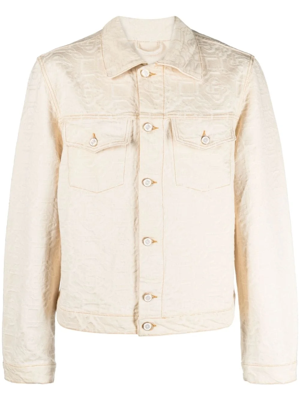 monogram-jacquard denim jacket Made from rigid cotton denim, this off-white jacket reflects Casablanca's penchant for branded motifs. Cut to a slim fit, it is emblazoned with a monogram jacquard throughout. Highlights - Off-white - Cotton - Denim - Monogram jacquard - Classic collar - Front button fastening - Two chest flap pockets - Long sleeves - Buttoned cuffs - Straight hem Imported Composition Cotton 100% SIZE & FIT Model measurements Height 6 ft 2 in(1.87 m) Bust/Chest 36.41 in(92.5 cm) Hips 35.43 in(90 cm) Waist 29.52 in(75 cm) FittingInformation Designed for a regular fit, allowing for a comfortably loose fit throughout the body Made from a midweight non-stretch fabric This piece fits true to size – take your usual size