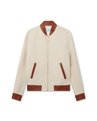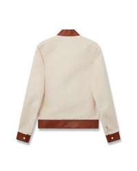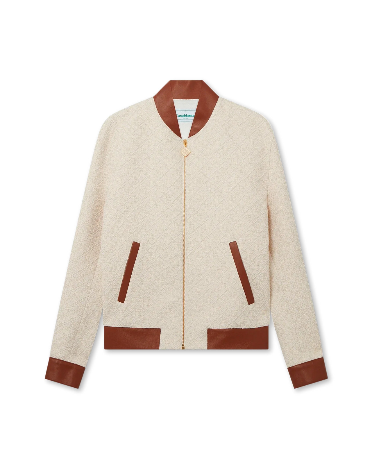 The monogram jacquard souvenir jacket is an all-over print style featuring the house's interlocking CC monogram with gold thread outlines, crafted from a monogram jacquard fabric. Completed with zip closure, lambskin welt pockets, hem, cuffs and baseball-style collar, enamel and gold-plated hardware. Monogram jacquard fabric 66% cotton 30% nylon Contrast: 100% lambskin nappa leather Colour: off-white and tan Specialised dry clean only Fits true to size, take your regular size