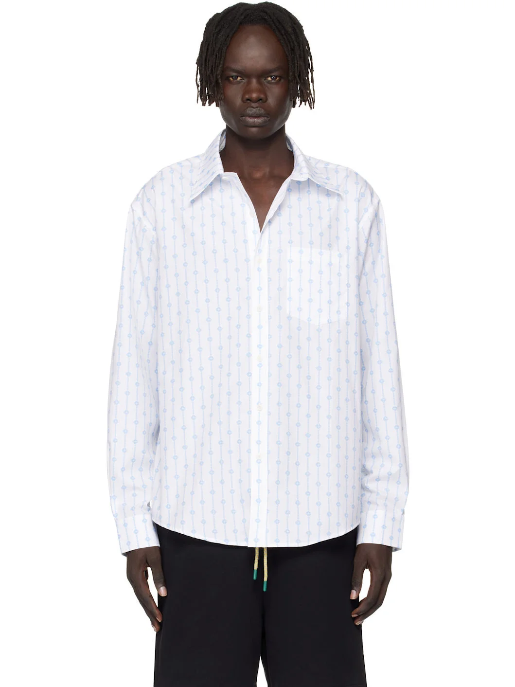 Cotton poplin shirt. · Logo pattern and stripes printed throughout · Spread collar · Button closure · Patch pocket at chest · Shirttail hem · Buttoned barrel cuffs · Box pleat at back yoke Supplier color: City stripe 100% cotton. Made in Italy 252195M192013