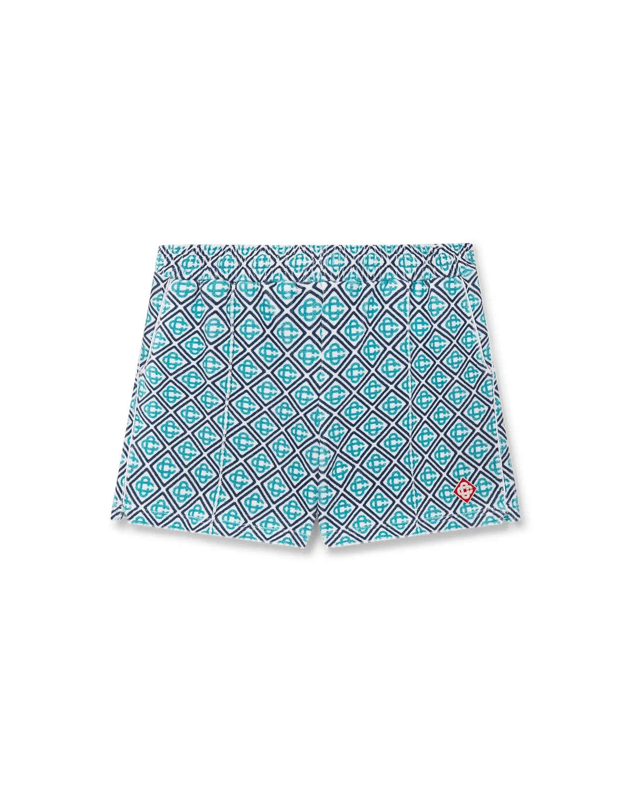 The Monogram towelling shorts are a classic design crafted from a monogram towelling fabric offering a twist on a signature Casablanca print. Completed with an elasticated waistband, internal gold-tipped drawstring fastening, pin tuck seams down the front, a back pocket with zip closure, slanted side pockets, and piping details on the back and front pockets and down the sides. - Monogram towelling fabric - 86% cotton 13% polyamide 1% elastane - Monogram print blue - Delicate machine wash - Made in Portugal - The model is 185cm/6'1 and is wearing a size M - Exclusive to casablancaparis.com and selected retailers