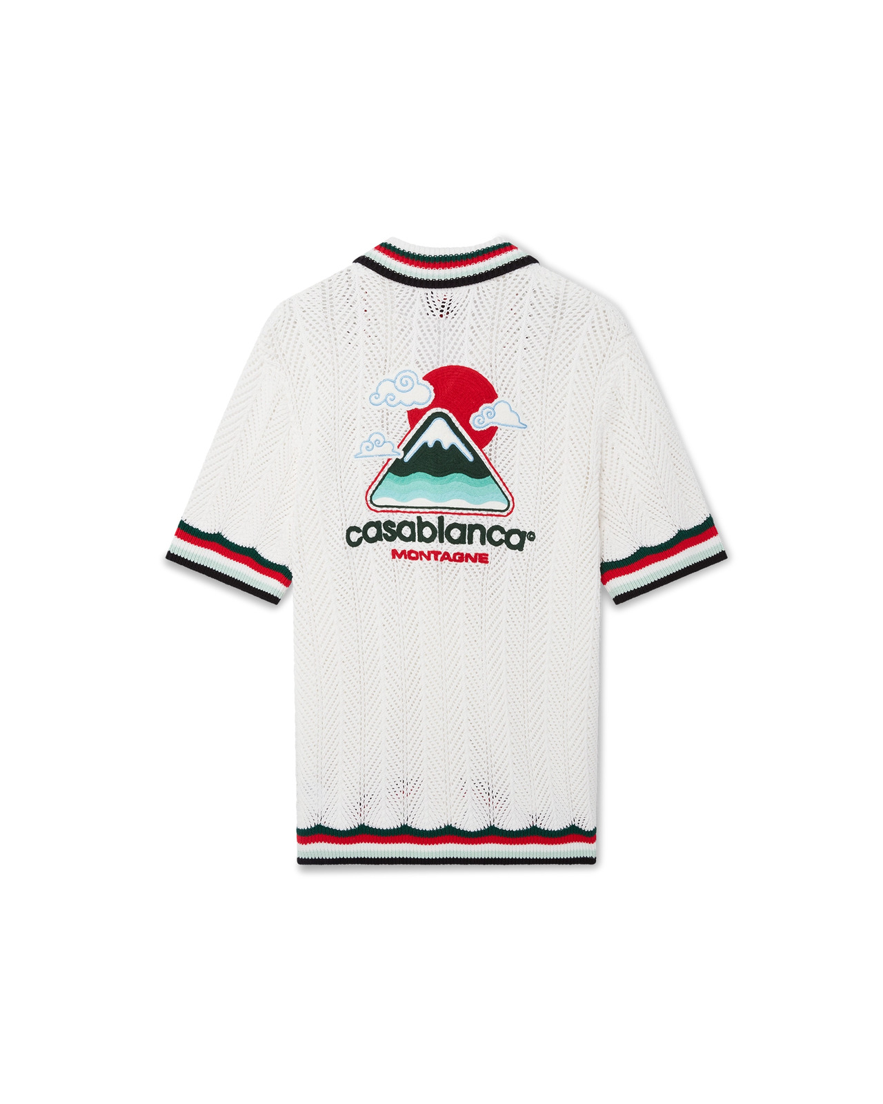 The Montagne Ondulee crochet shirt is a short-sleeve knitted design crafted from crochet cotton fabric and features the house's signature diamond logo and seasonal artwork - using Japan's rich iconography as inspiration for this collection, with a simple layout and artwork, conveying a strong visual message with just a few lines and colours, making it one of the emblems of the collection. Completed with button closure, signature gold rim pearl buttons, and ribbed striped edge detail on the collar, cuffs and hem. - Crochet cotton fabric - Main: 100% cotton - Embroidery: 100% acrylic - Colour: white/multicolour - Specialised dry clean only - Made in China - Oversized fit - The model is 187cm/6'1 and is wearing a size M