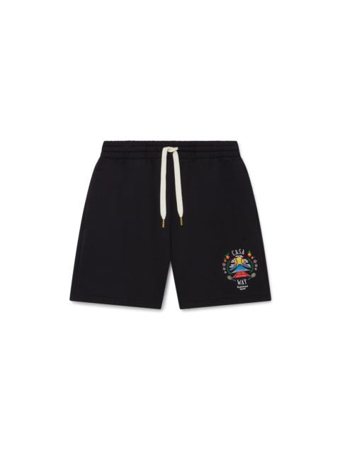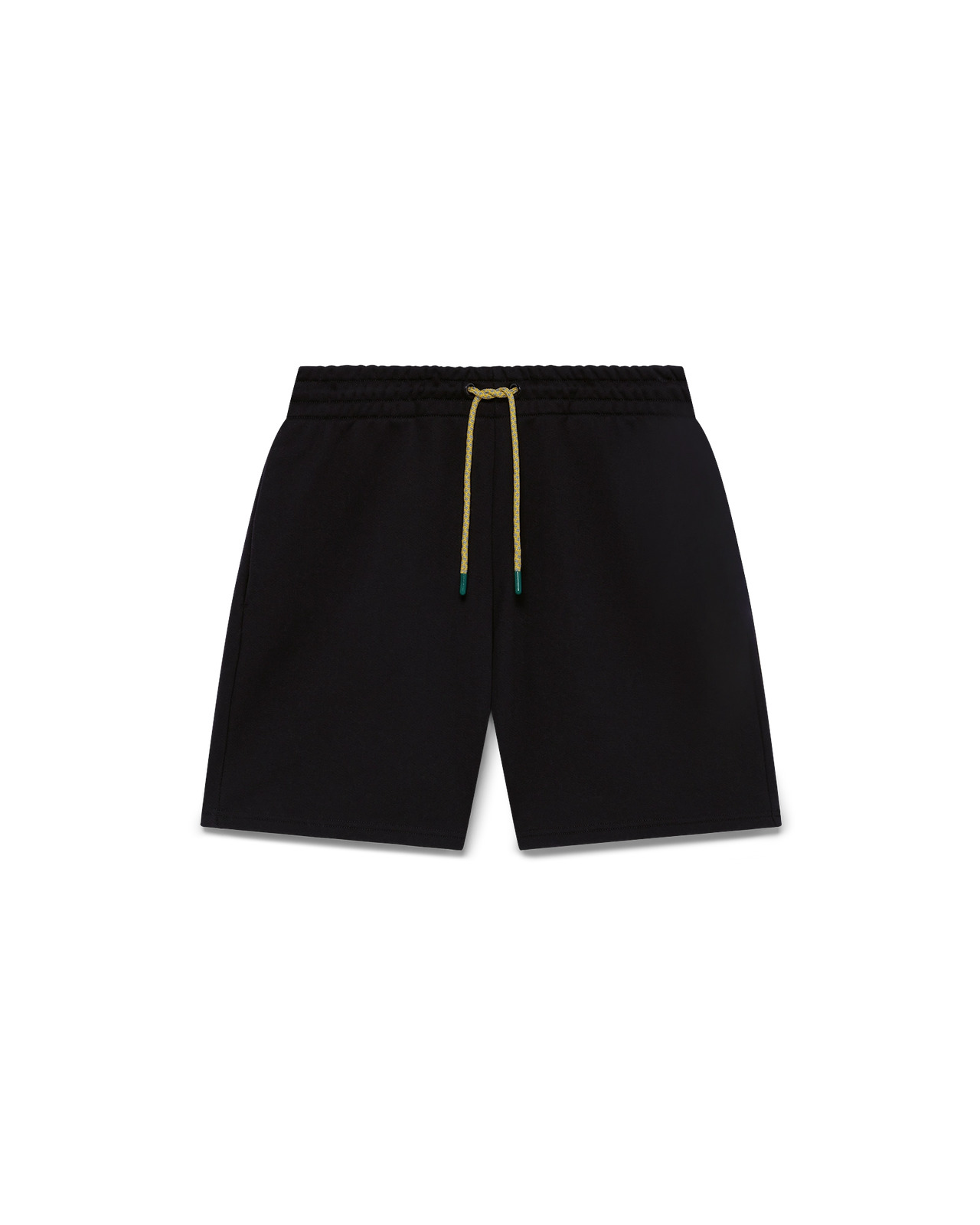 The Montagne sweatshorts are a classic sportswear design crafted from organic cotton fabric. Completed with an elasticised waistband, drawstring fastening, a back pocket featuring the house's primary colours with a zip closure, and in-seam side pockets. - Cotton loopback jersey fabric - Main: 100% organic cotton - Lining: 100% organic cotton - Colour: black - Delicate machine wash - Made in Portugal - Relaxed fit - The model is 187cm/6'1 and is wearing a size M