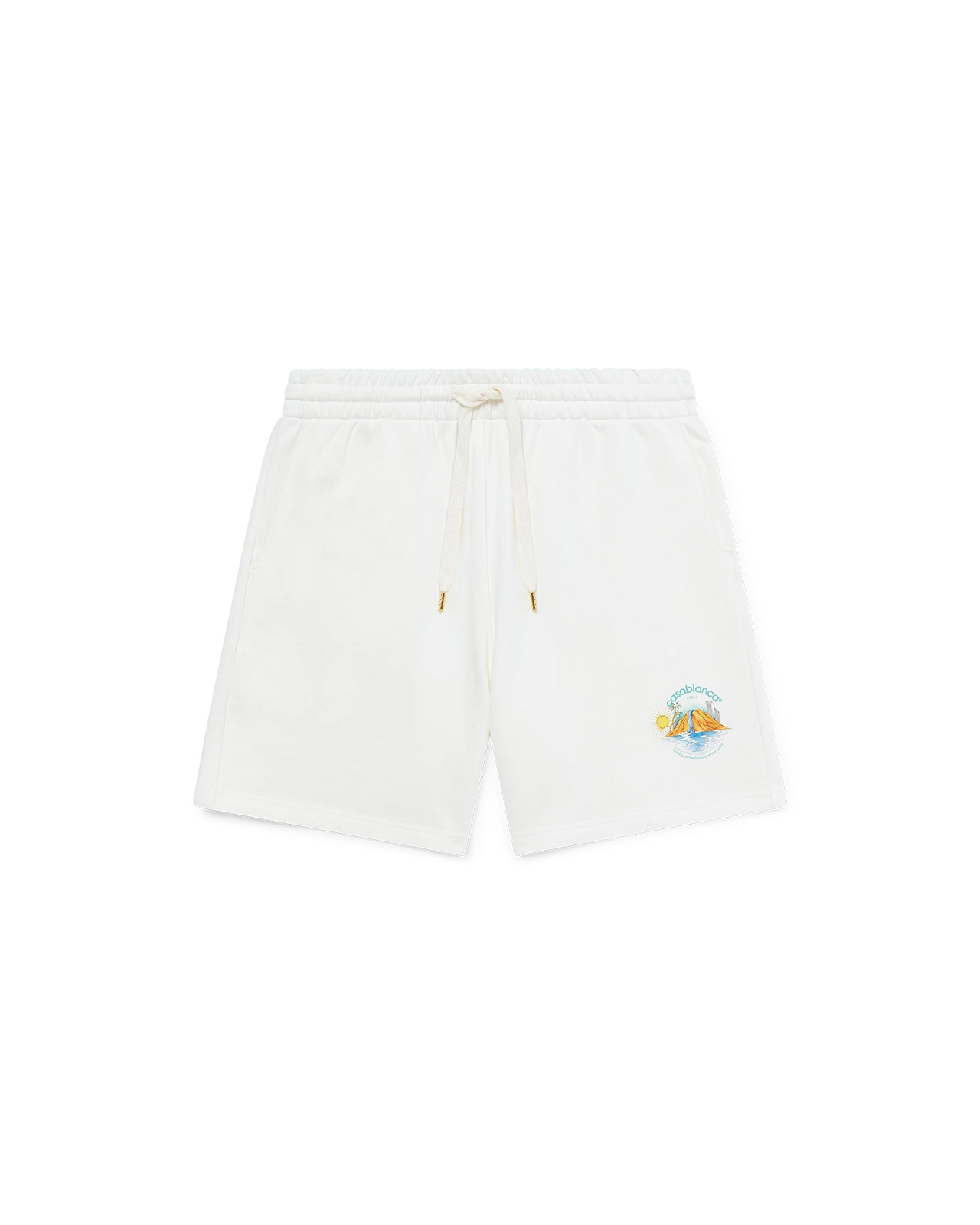 The Oasis sweatshorts are printed design crafted from organic cotton fabric, featuring the house's seasonal artwork with design elements of nature, architecture, and tennis. Completed with an elasticated waistband, gold-tipped drawstring fastening, in-seam side pockets, and a back patch pocket. - Printed cotton fabric - 100% organic cotton - Colour: white - Delicate machine wash - Made in Portugal - The model is 185cm/6'1 and is wearing a size M - Exclusive to casablancaparis.com and selected retailers