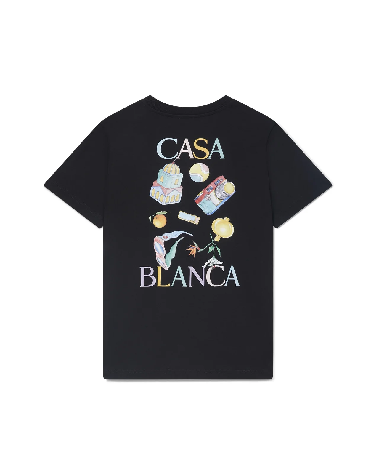 The Objets En Vrac t-shirt is a short-sleeve printed design featuring iconic furniture and art objects within the apartment reimagined to blend seamlessly with our unique style in this season's pastel colours. Crafted from organic cotton, complete with a classic ribbed crew neck. - Cotton blend fabric - 100% organic cotton - Colour: black - Delicate machine wash - Made in Portugal - Fits true to size, take your regular size - Exclusive to casablancaparis.com