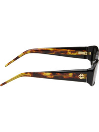 Rectangular semi-transparent tortoiseshell acetate-frame sunglasses. · Gray lenses · 100% UVA/UVB protection · Integrated nose pads · Logo stamp at temples · Exposed core wires · Includes case · Size: 56.18 137 Supplier color: Black Acetate. Made in Japan 252195M148000