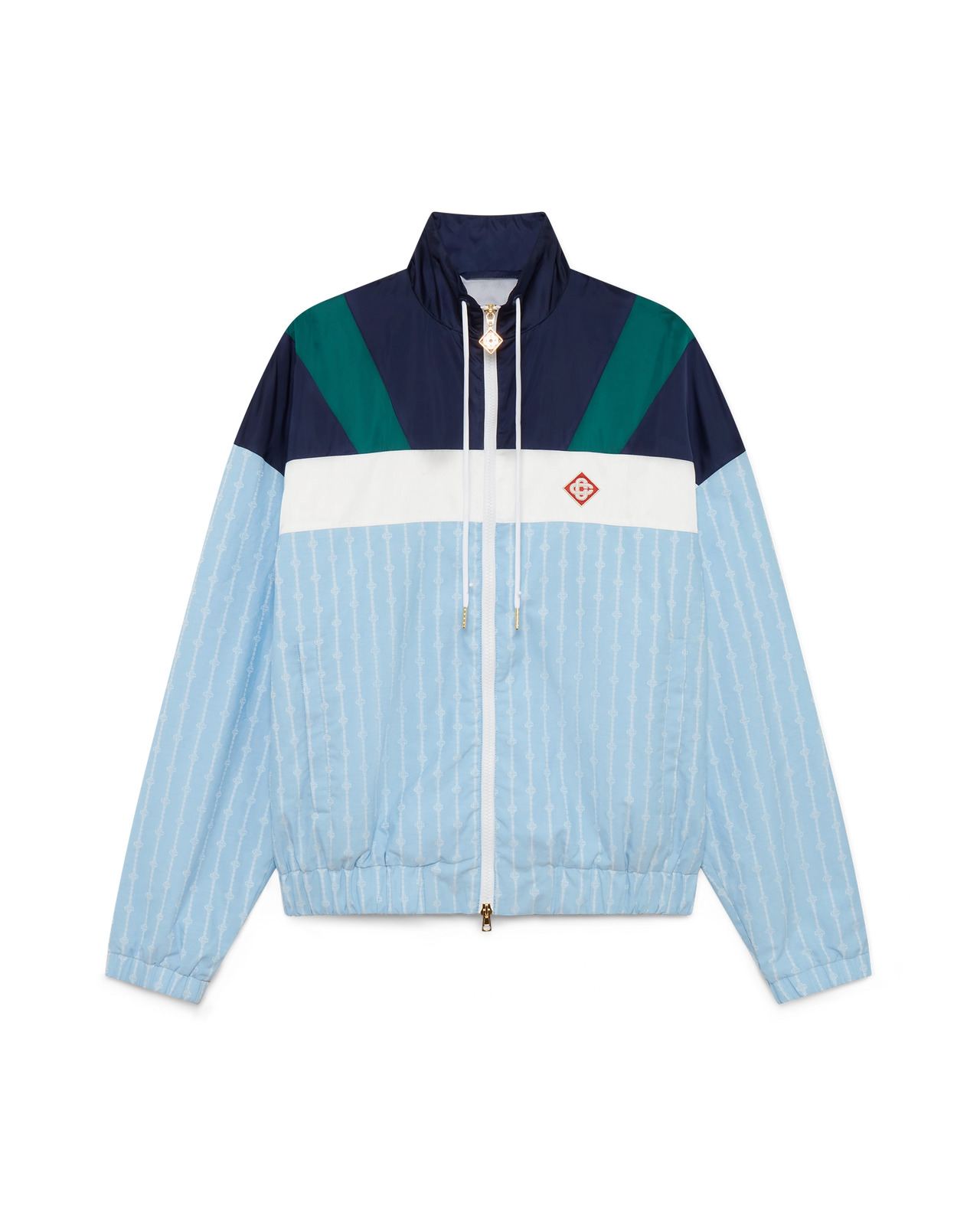 The Pinstripe nylon track jacket is a sportswear design crafted from a cotton blend fabric featuring the house's signature diamond logo. Completed with zip closure, navy, green and white panels on the shoulders and chest, a polo neck with drawstring fastening, vertical welt pockets, a rain shield and vent panel, and elasticated hem and cuffs. - Technical fabric - 97% cotton 3% viscose - Colour: pin stripe blue - Specialised dry clean only - Made in Portugal - Unisex, take your regular size - The model is 187cm/6'1and is wearing a size M